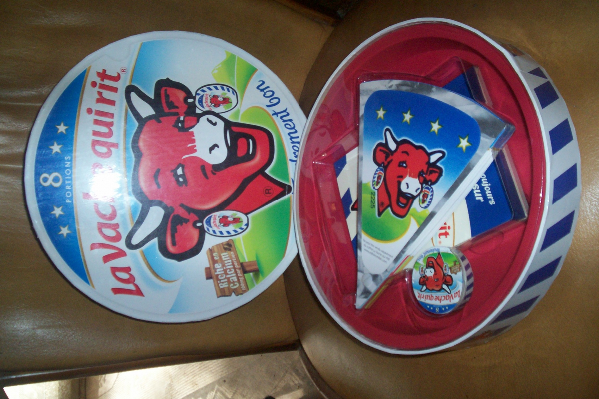 grosse boite cofffret publicitaire vache qui rit 22 cm de diametre au moins et 5 d'épaisseur contenant livre + 29 recettes de cuisine + magnet pub vache qui rit objet comme neuf . coffret carton dur .