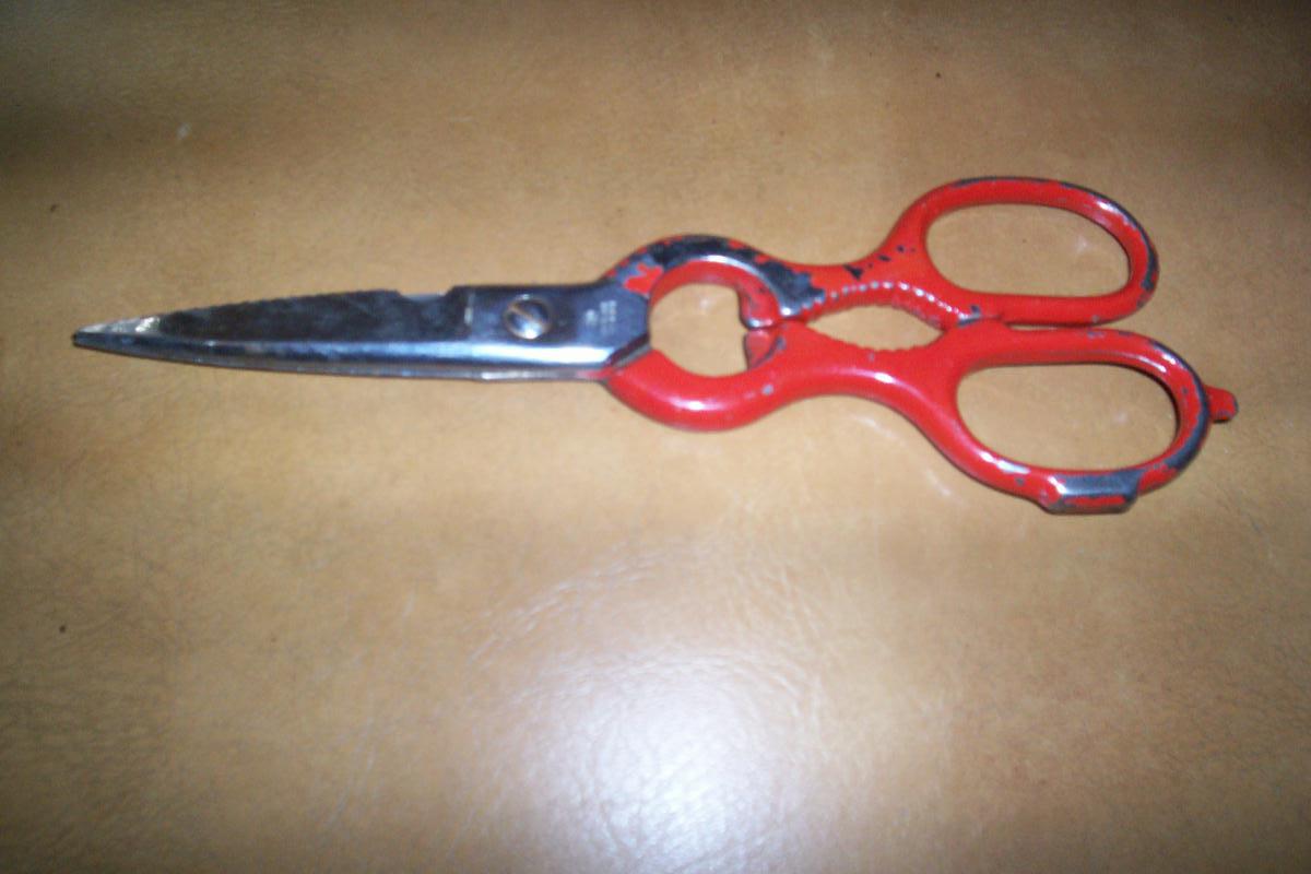 ancienne paire de ciseaux 20 cm de long un coté lame plate et l'autre coté lame crantée et une encoche demi cercle peinture un peu dégarnie sinon métal acier pas de rouille propre .