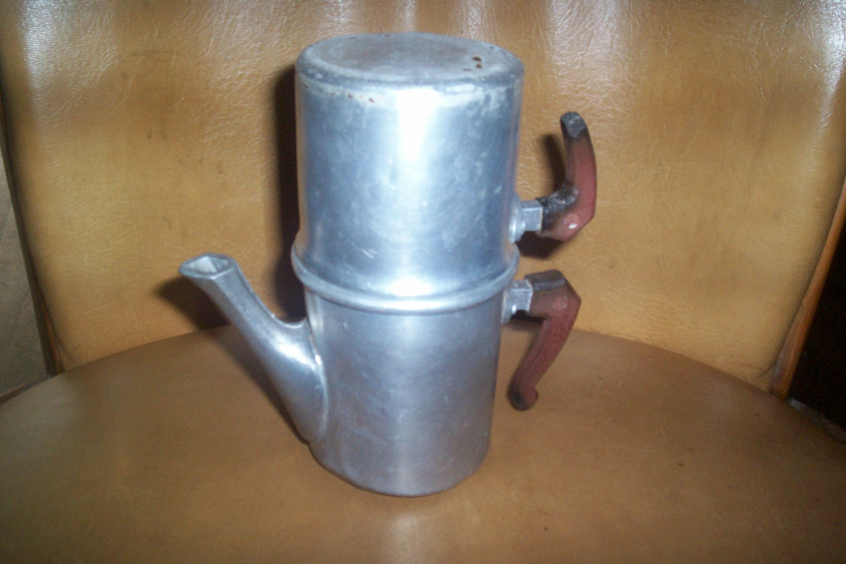 rare petite cafetière pour 2 tasses objet en métal blanc aluminium de la période 1950/60 dans l'état bon état. 17 cm de haute environ .