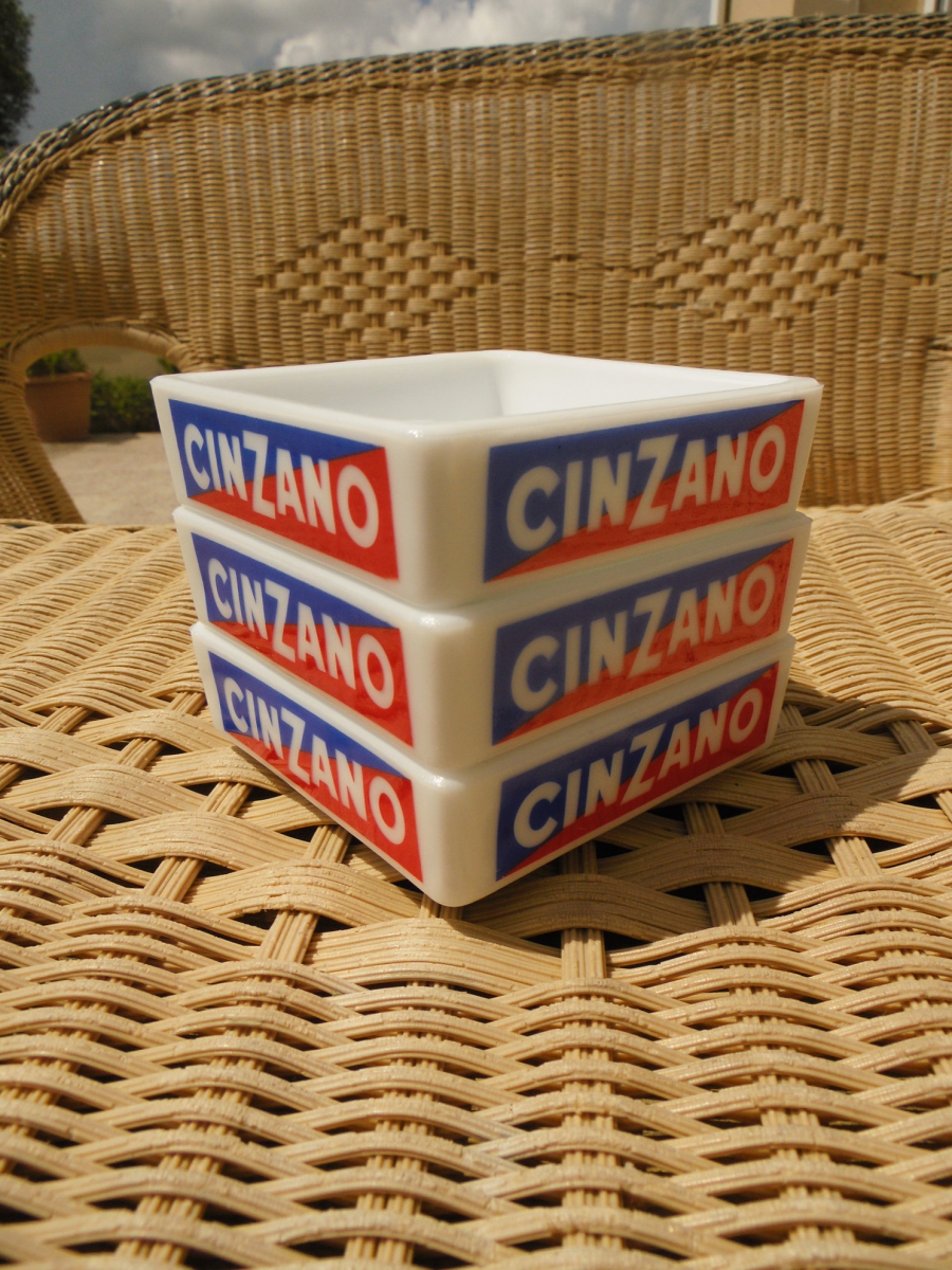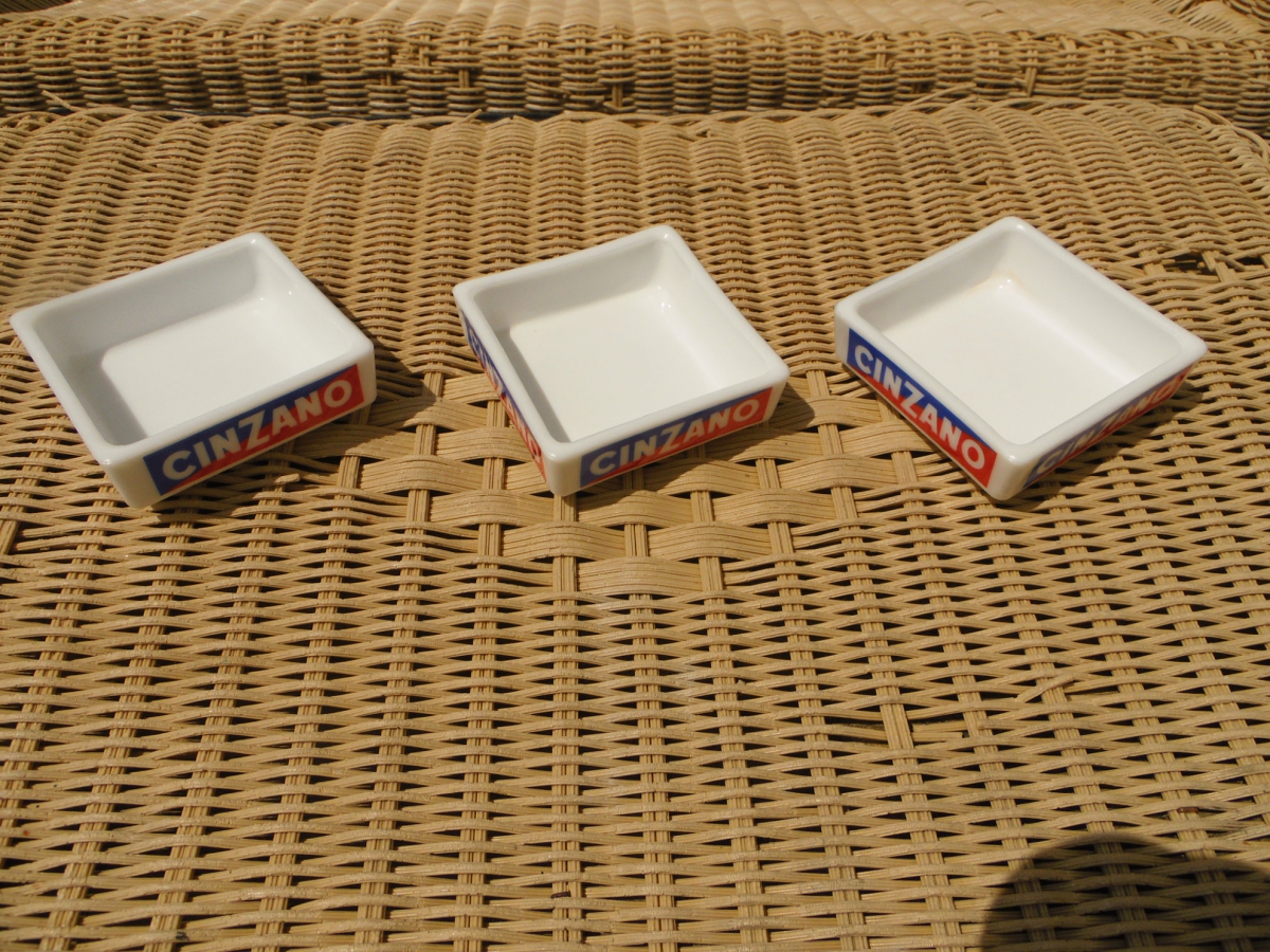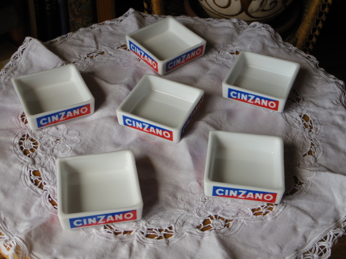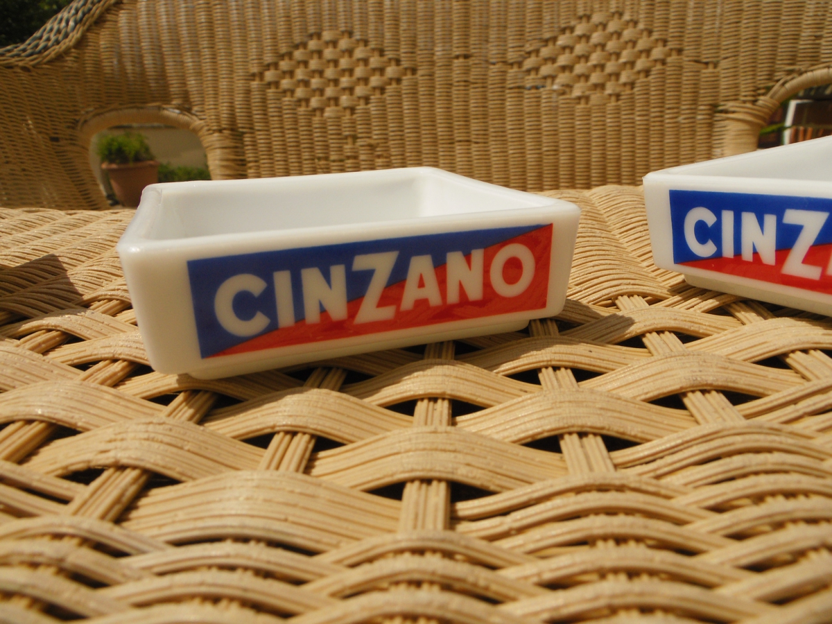 Coupelle aperitive en opaline blanche marque opalex , publicité pour la boisson aperitve CINZANO ecrit en bleu blanc et rouge sur chaque face .Forme carrée de coté 9 cm. hauteur3 cm, profondeur 2.5 cm. Courante dans les années 80/90 sur tableou comptoir de bistrot pour presenter les biscuits aperitifs ou cacahuetes! En tres bon etat. Prix a l'unité , il y a 6coupelles disponibles!