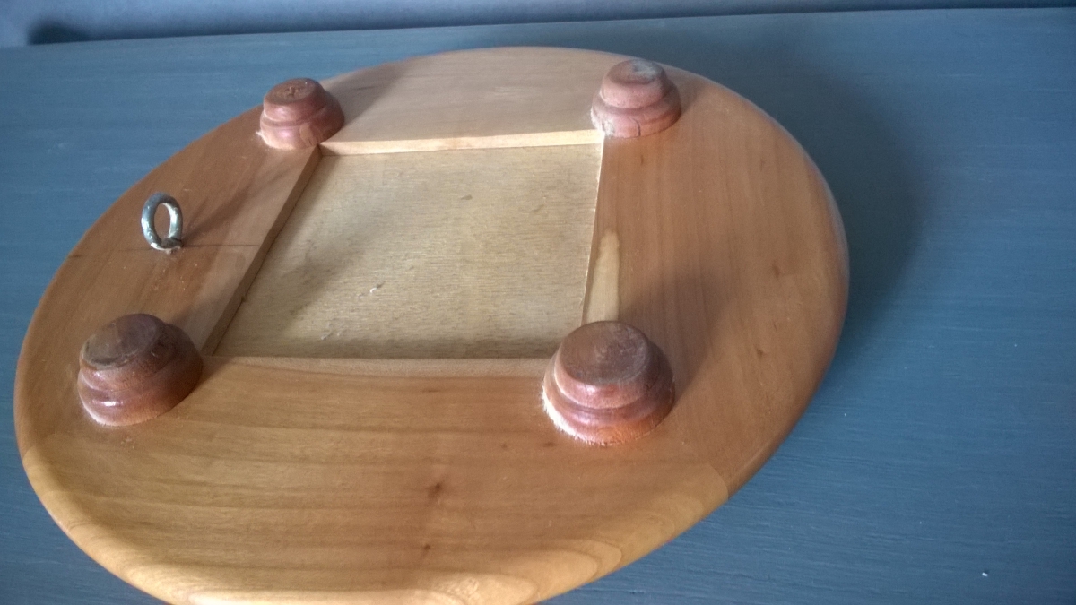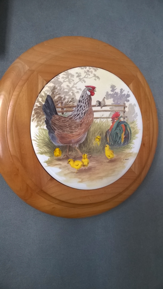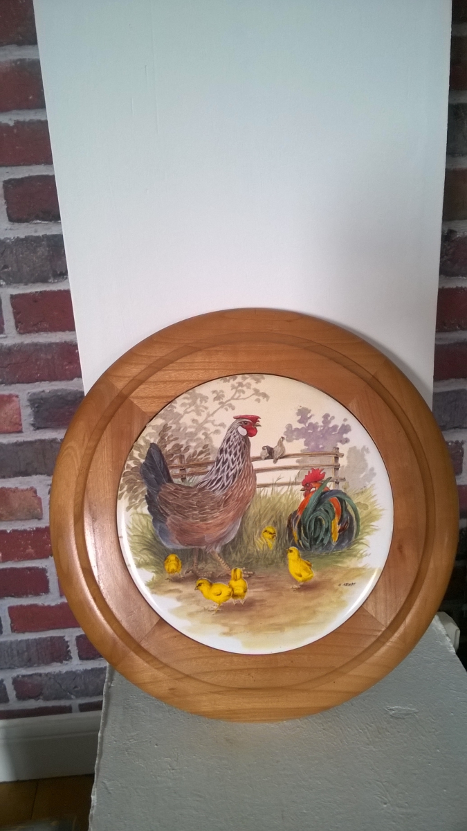 Très beau dessous de plat représentant une poule et ses poussins sur carreau de faïence dans un cadre rond en bois vernis.