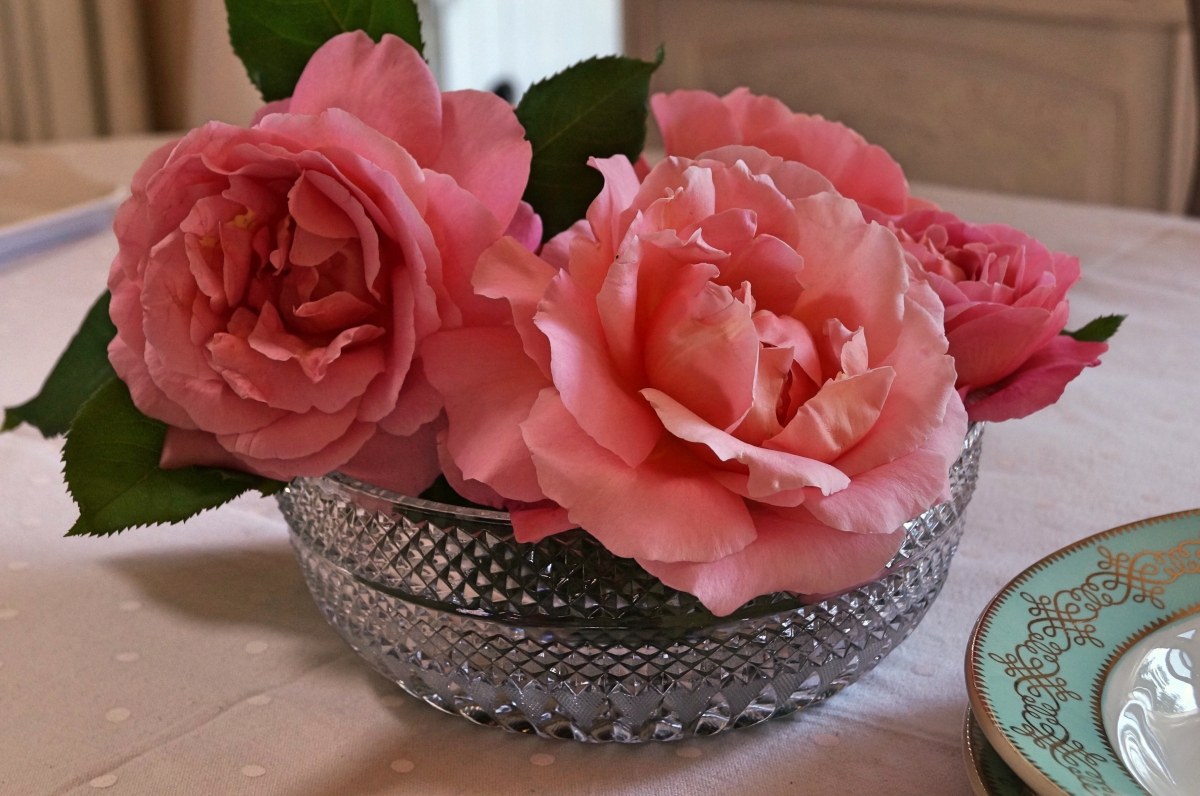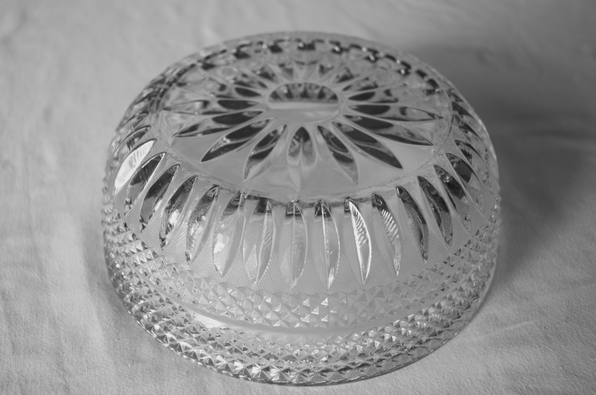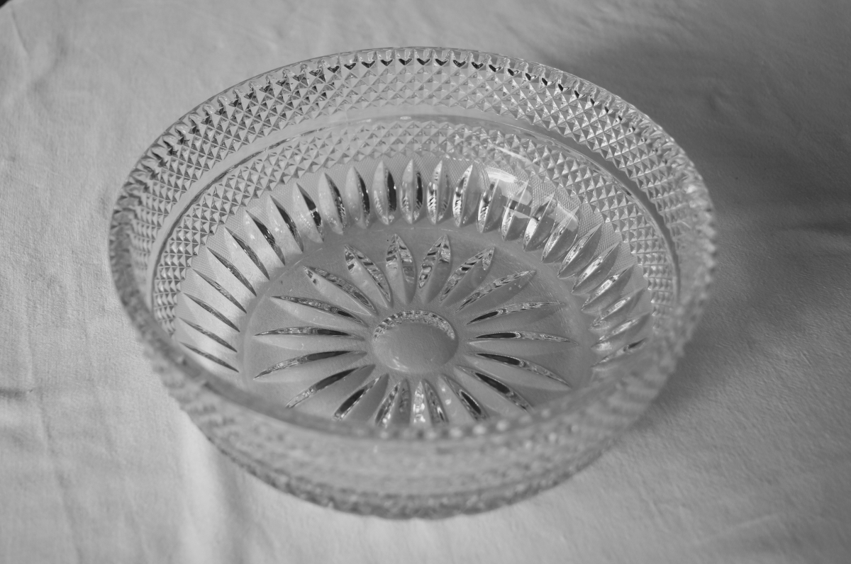 Saladier rond, en verre épais, utilisé ici pour fleurir un centre de table.