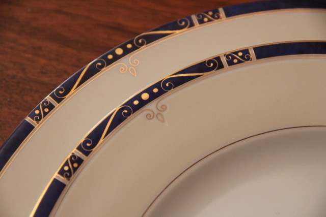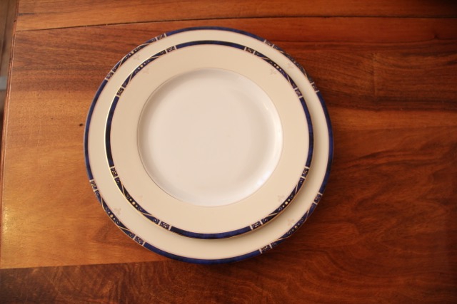 Assiettes en Porcelaine de Limoges : blanches avec tour beige et liseré bleu nuit et or.