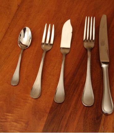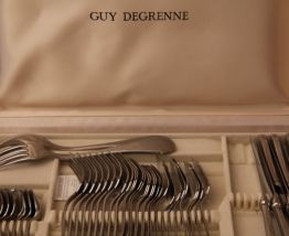 10 grandes fourchettes/ 10 petites fourchettes/ 10 couteaux poisson/ 12 petites cuillères+ 1 fourchette et cuillère de service.