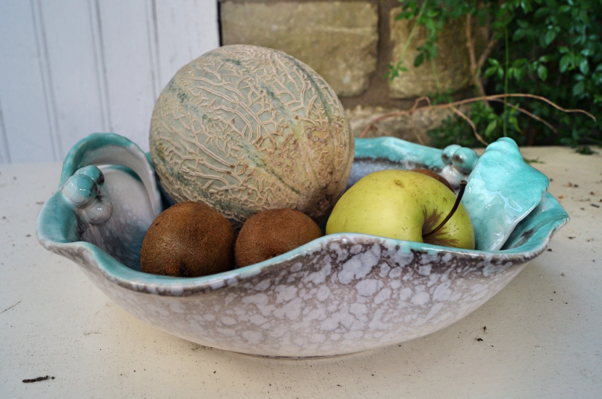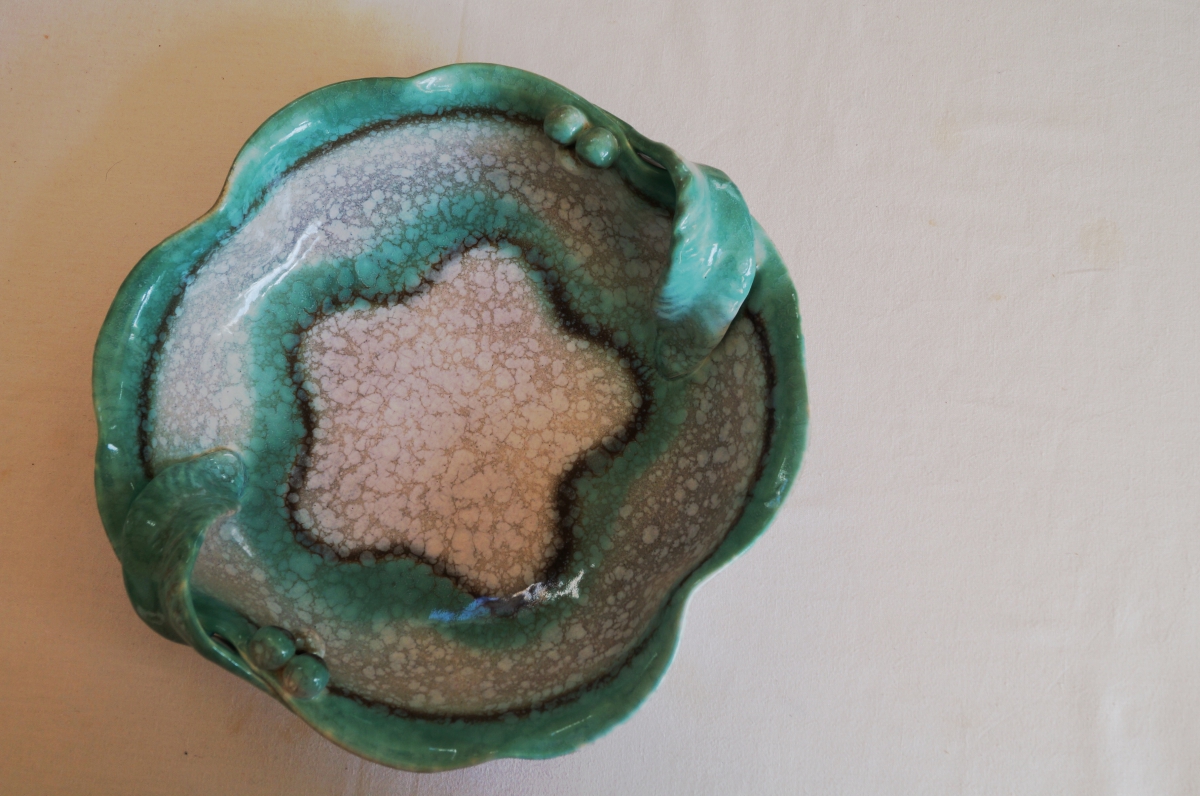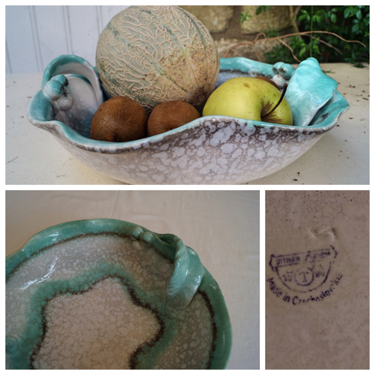 Saladier vintage en céramique tchèque de Ditmar et Urbach, en dégradé de ton bleu et gris tacheté.