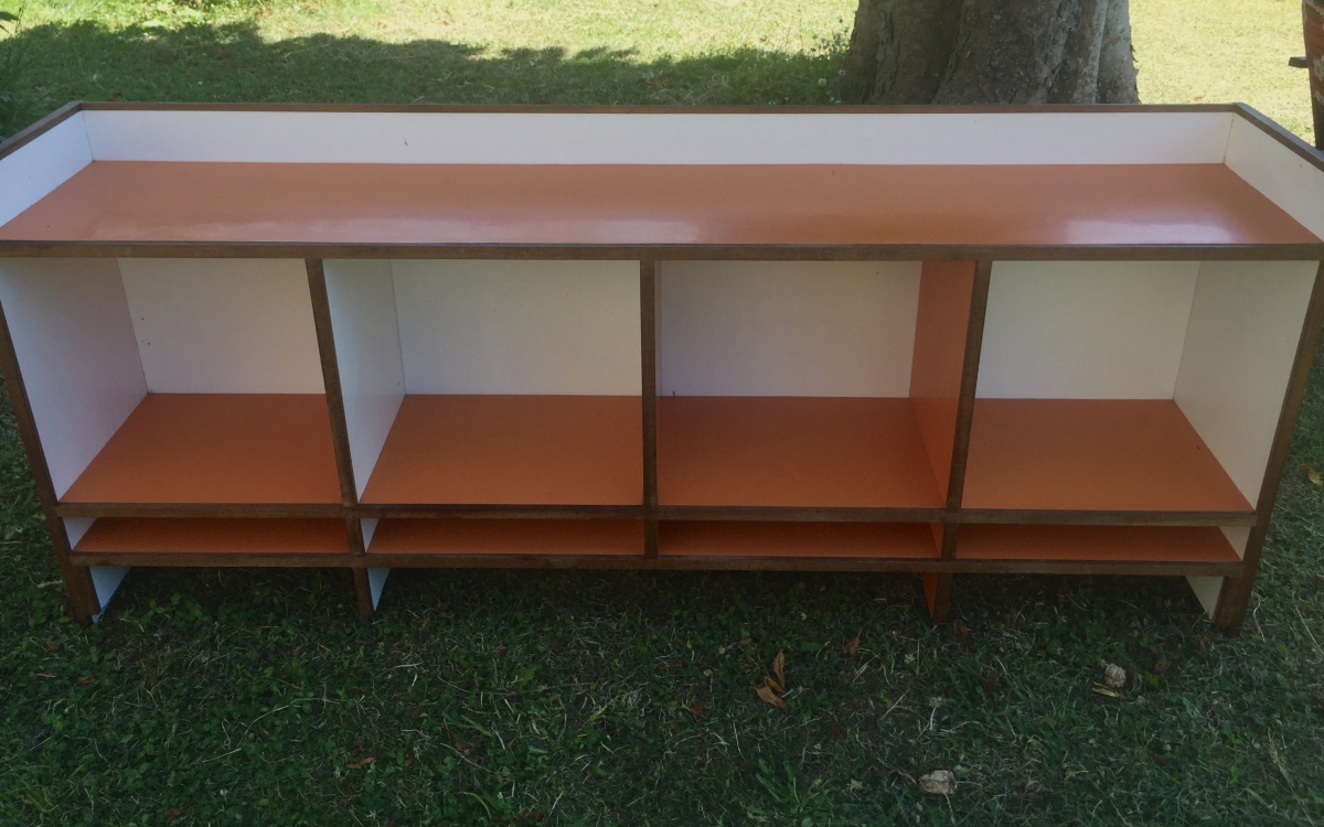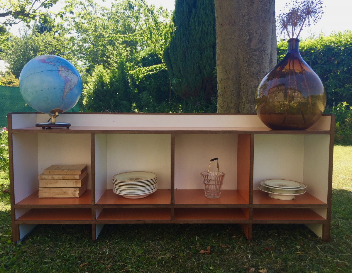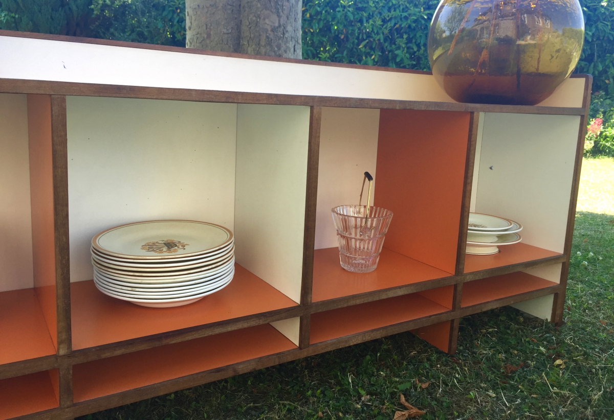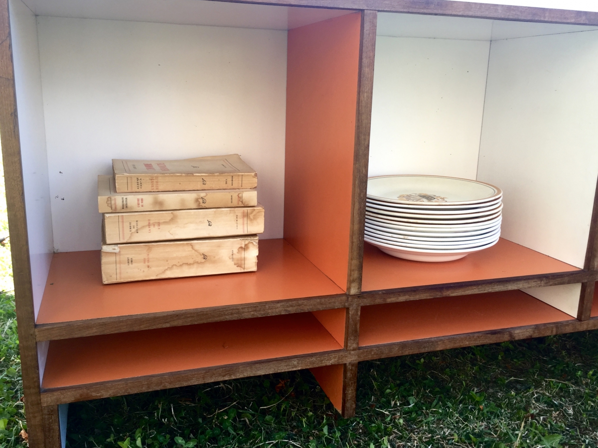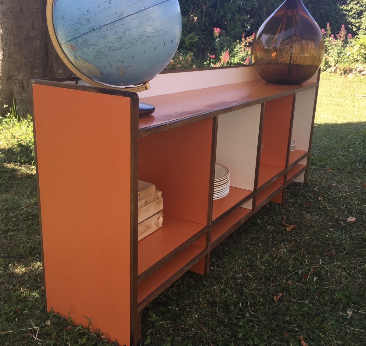 Enfilade/ Bibliothèque 60 en bois orange et blanc. Ce meuble était une étagère de bureau d'une entreprise qui a fermé ses portes. Elle est de belle facture : pas de clou ni vis apparents. Elle est soulignée de finitions en bois qui lui donnent son élégance.