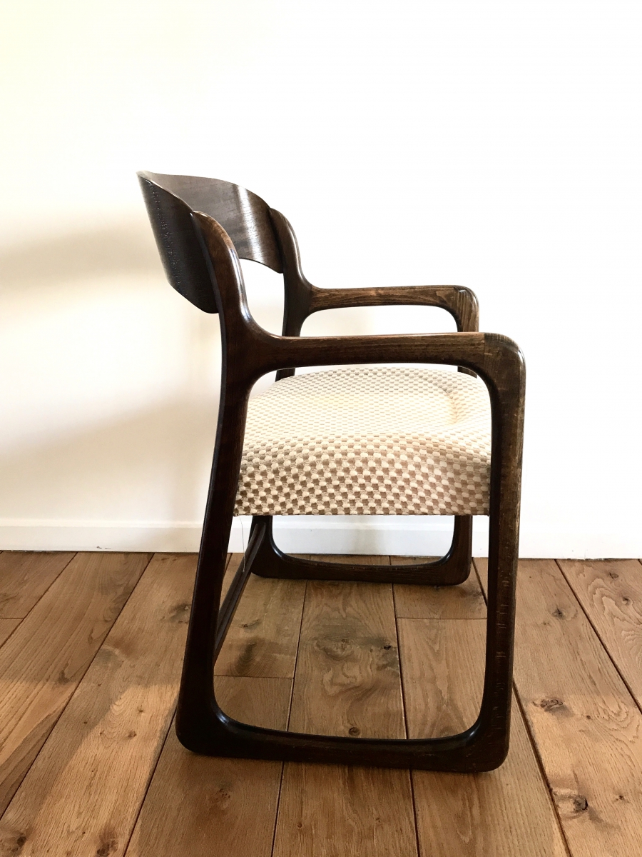 Fauteuil Traineau de l'entreprise BAUMANN, spécialiste du bois courbé, en parfait état. Appelé également "chaise luge". Modèle à accoudoirs, en bois sombre et au design élégant.