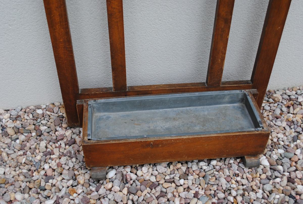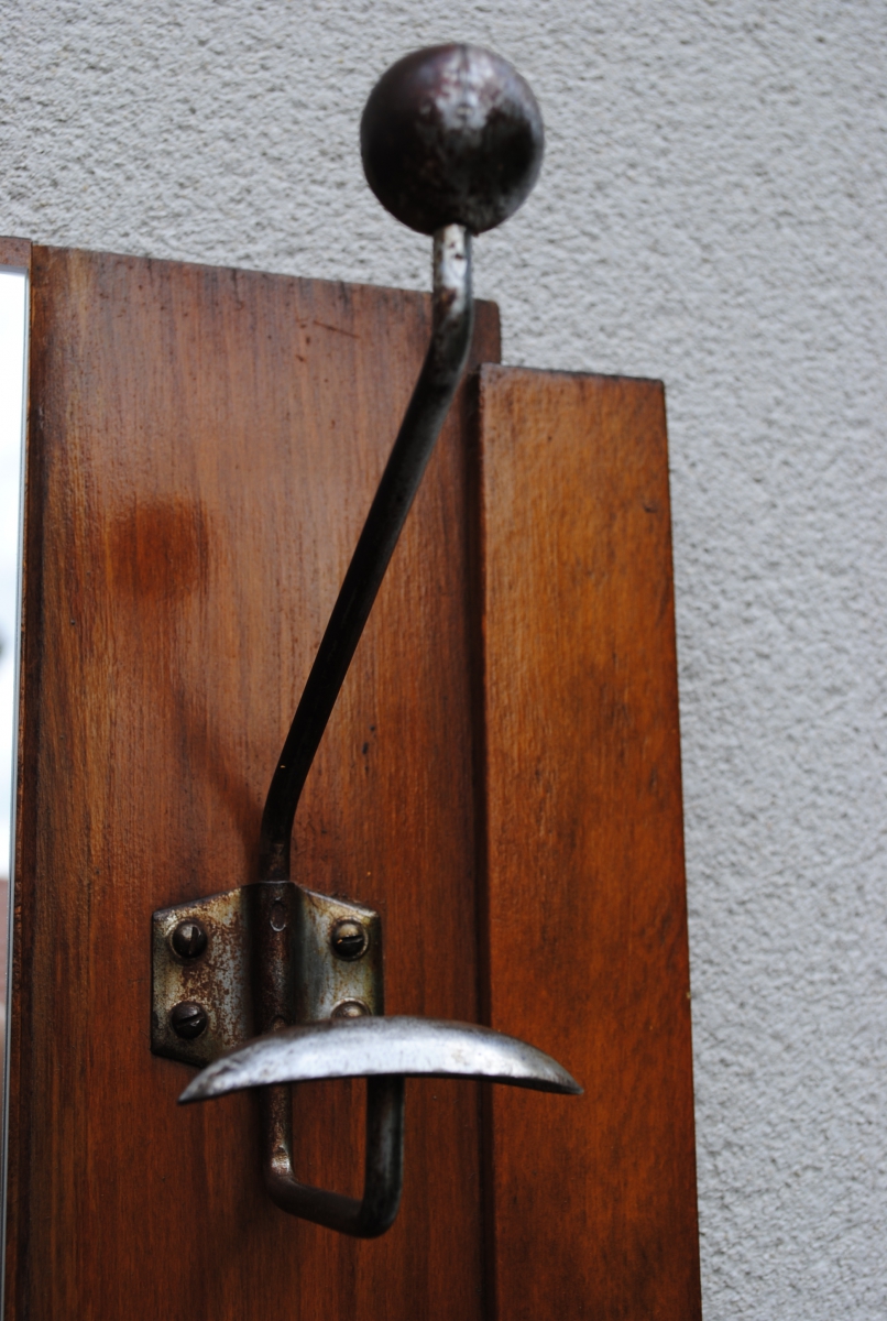 Vestiaire bois année 50 , Glace neuve et porte parapluie en fer forgé . Bac en zinc , patères traitées anti rouille . Hauteur 187 cm. Largeur 62 cm. Profondeur 22 cm.