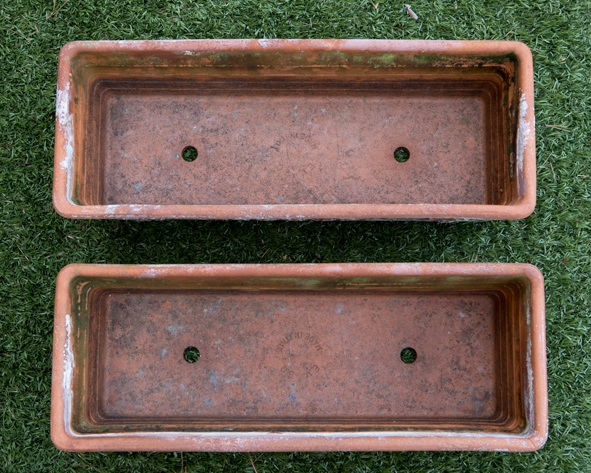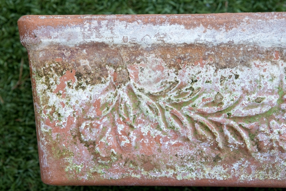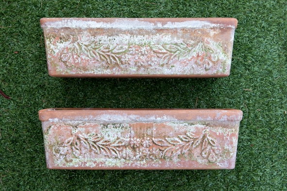 Très jolies jardinières en terre cuite avec décor guirlande de fleurs en relief.
