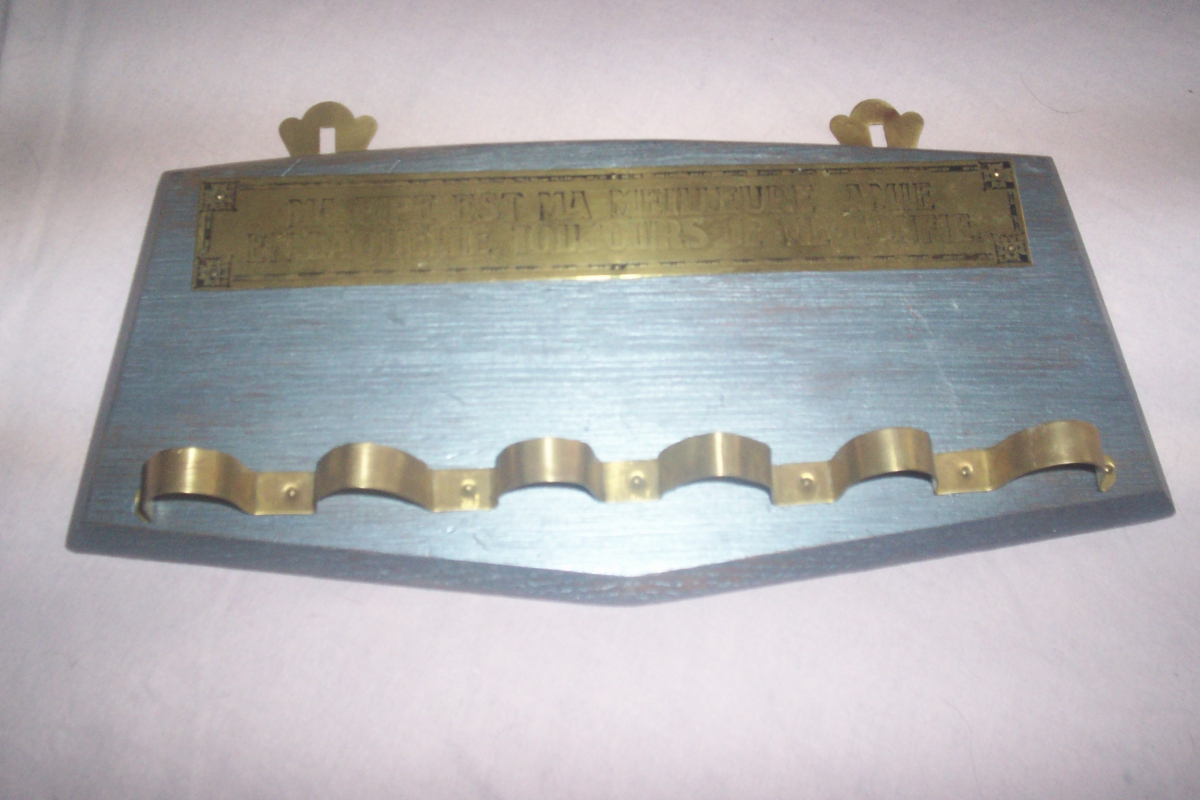 porte pipes murales en bois et cuivre 28 cm de long sur 14 cm de large pour 6 pipes fumeurs et légender ma pipe est ma meilleure amie en laquelle toujours je me confie objet en très bon état .