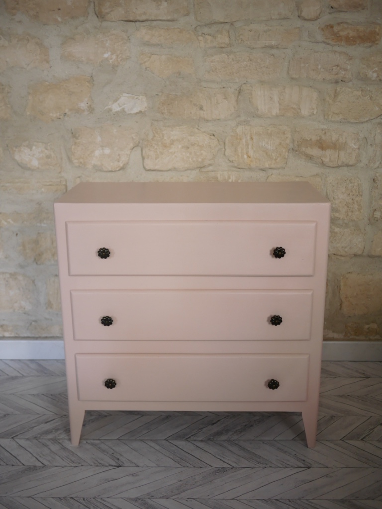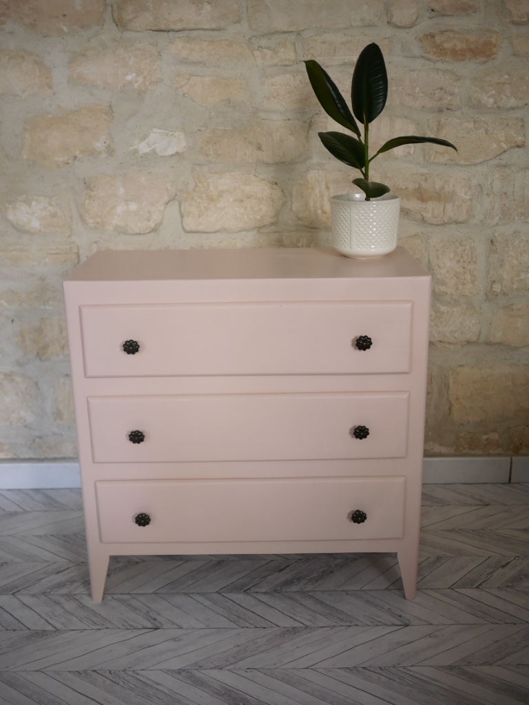Jolie commode ancienne à 3 tiroirs, rénovée, poncée et peinte et vernie, dans un joli rose poudré (rose "diva" du nuancier Flamant).
