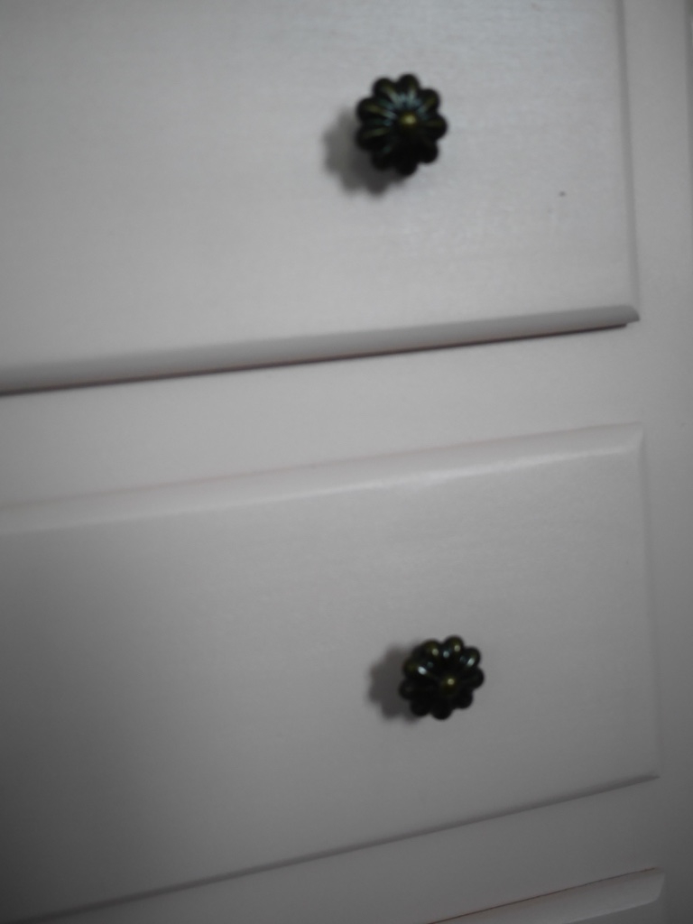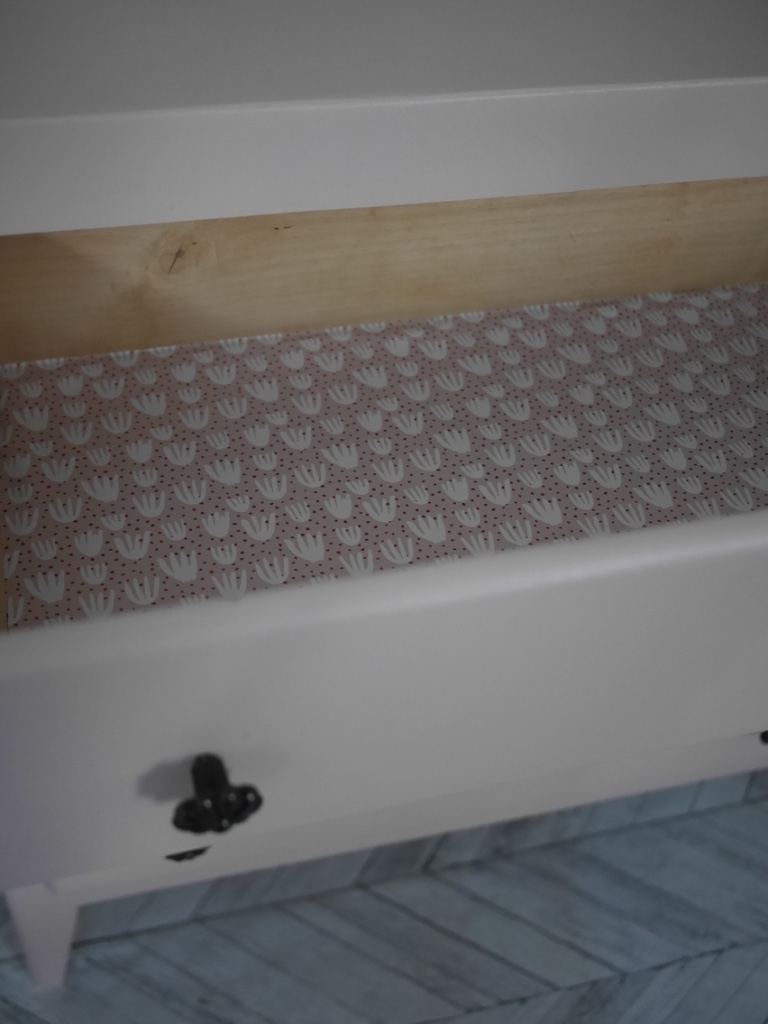 Le fond des tiroirs est tapissé de vinyle à motifs.