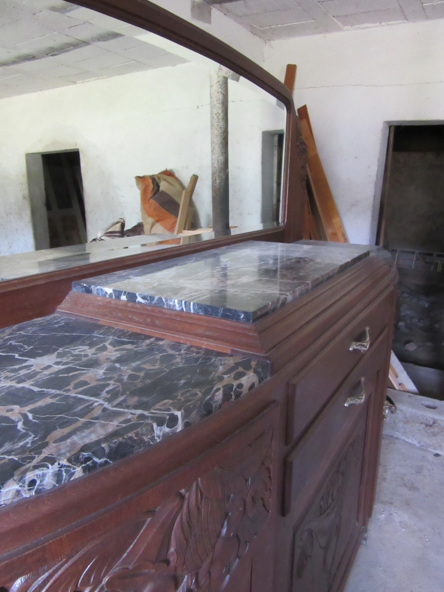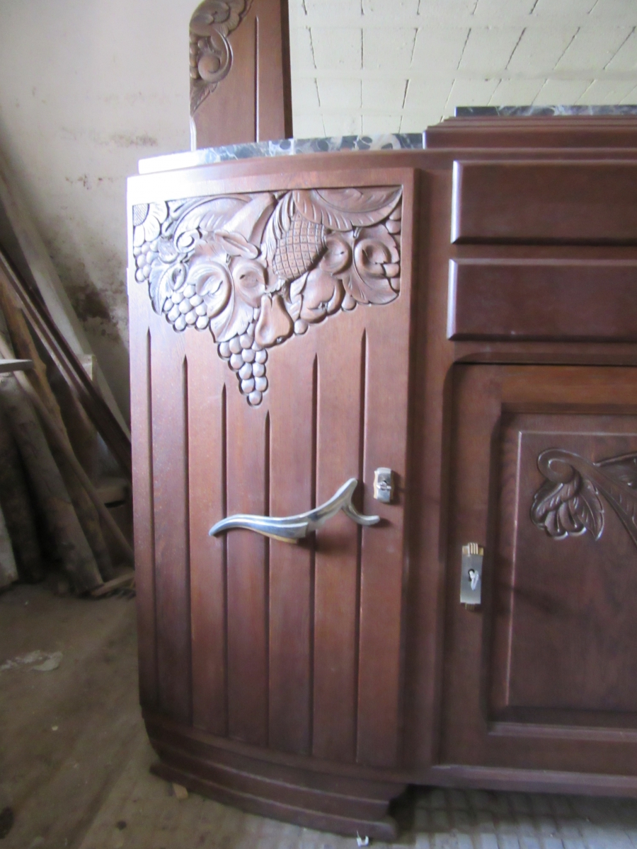 Chêne massif, travail d'ébéniste des années 1950. Plaques en marbre et miroir. Bon état, photos supplémentaires sur demande. Prix à débattre.