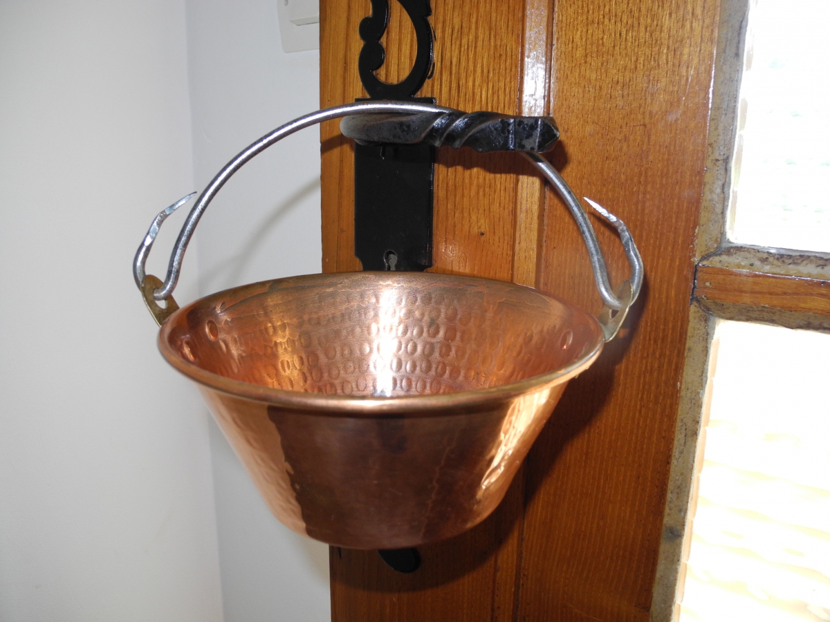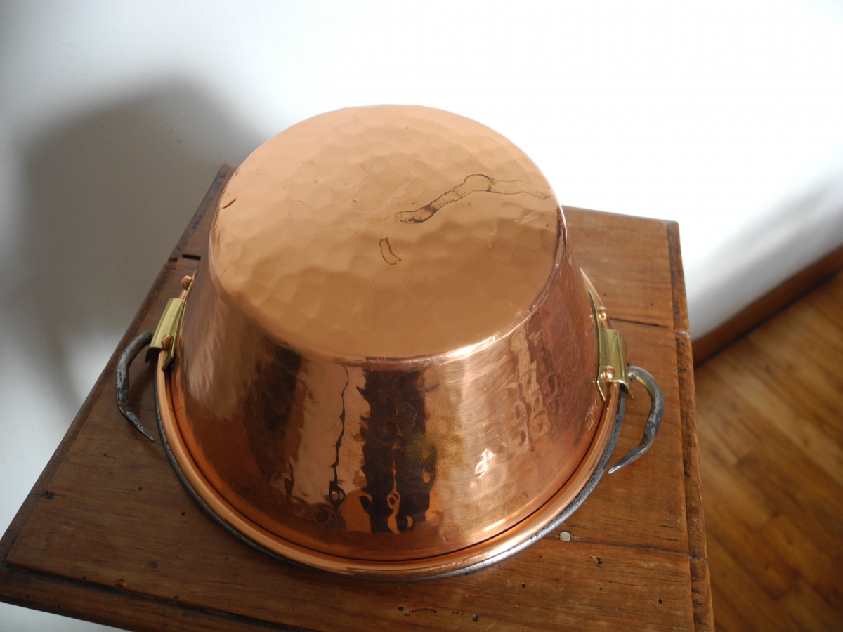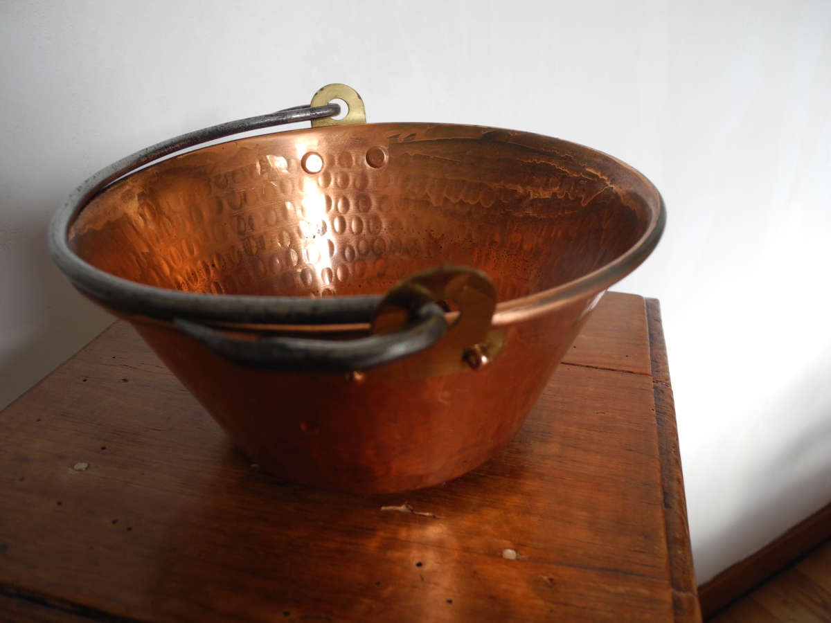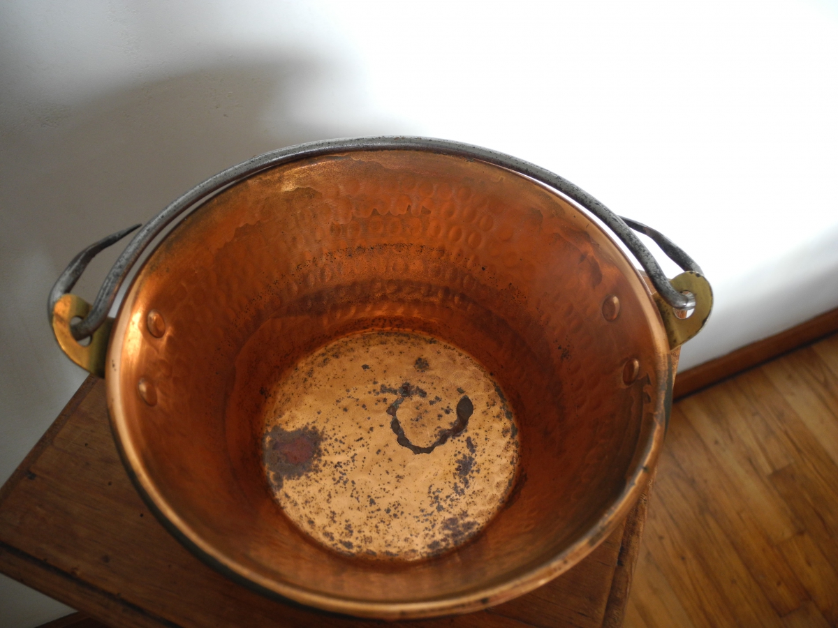 Petite marmite ou chaudron à anse déco en cuivre martelé, fabriqué à Villedieu les Poêles, années 50