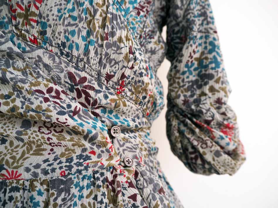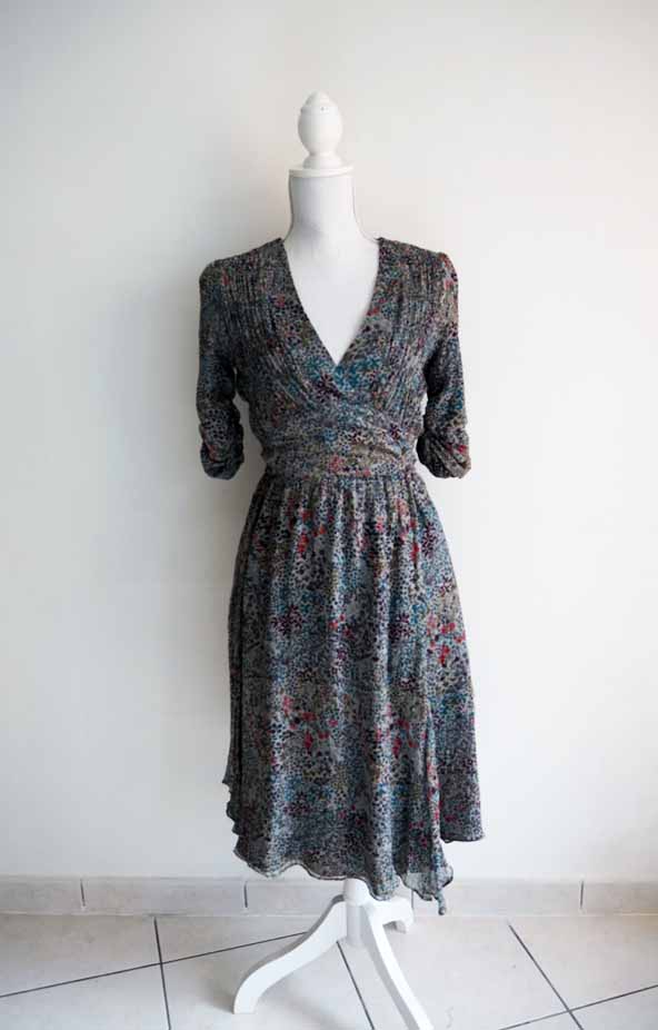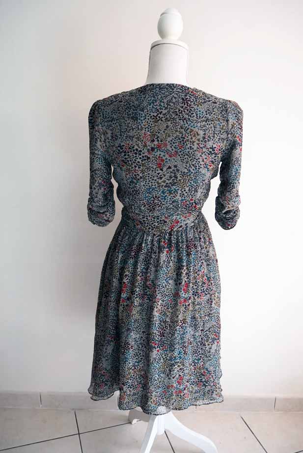 Robe grise avec motif fleuri (ou liberty) multicolore.