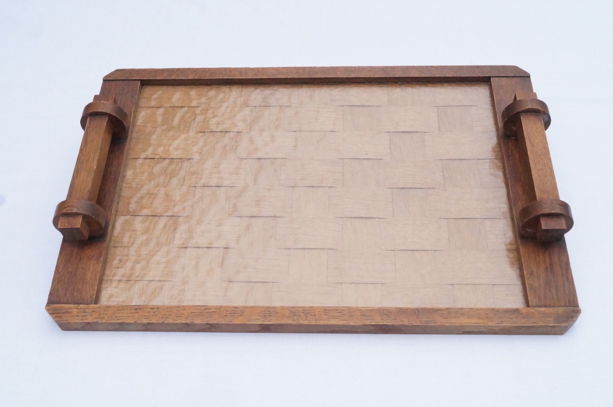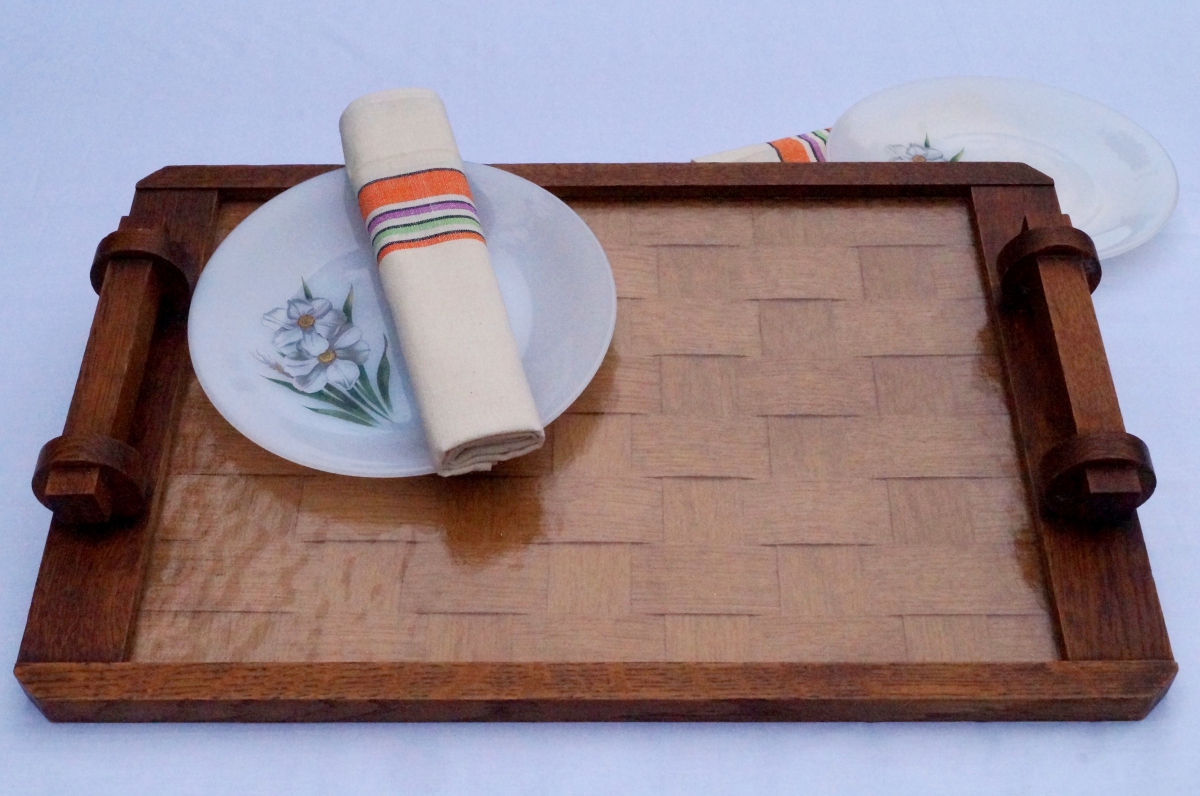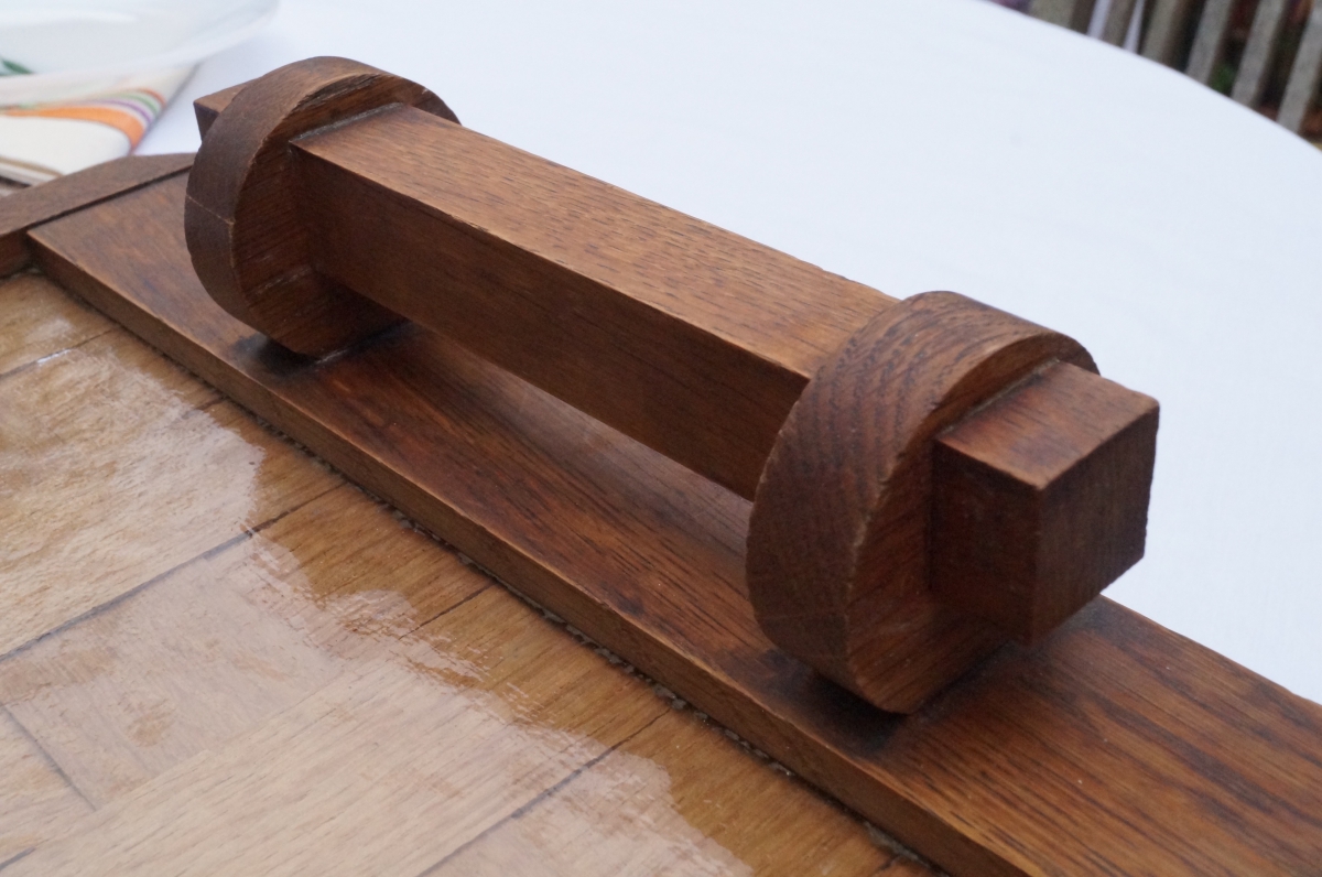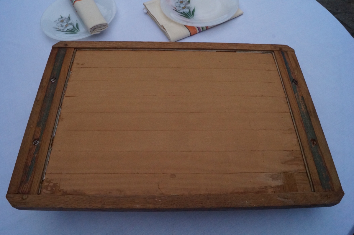 Beau et grand plateau en bois et verre des années 40, fond en lamelles de bois tissées en damier.