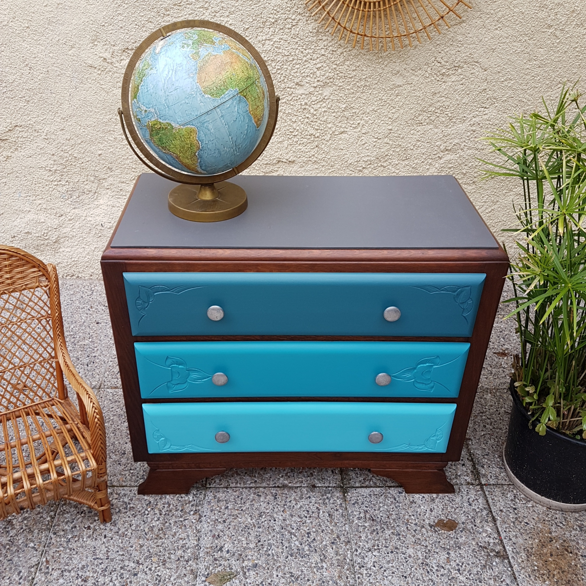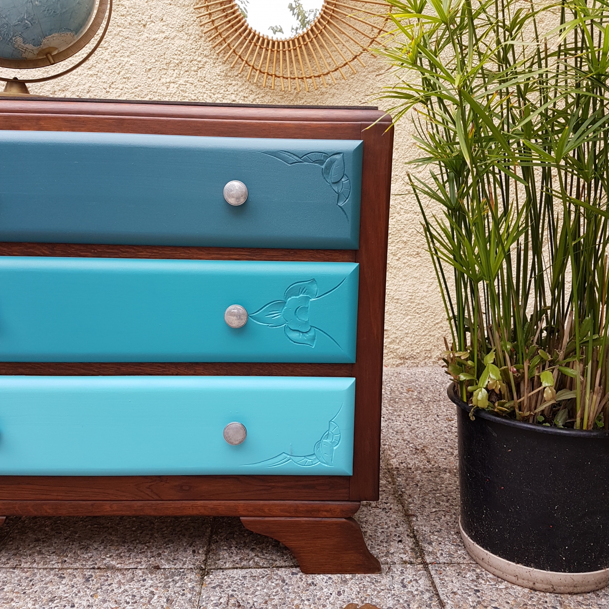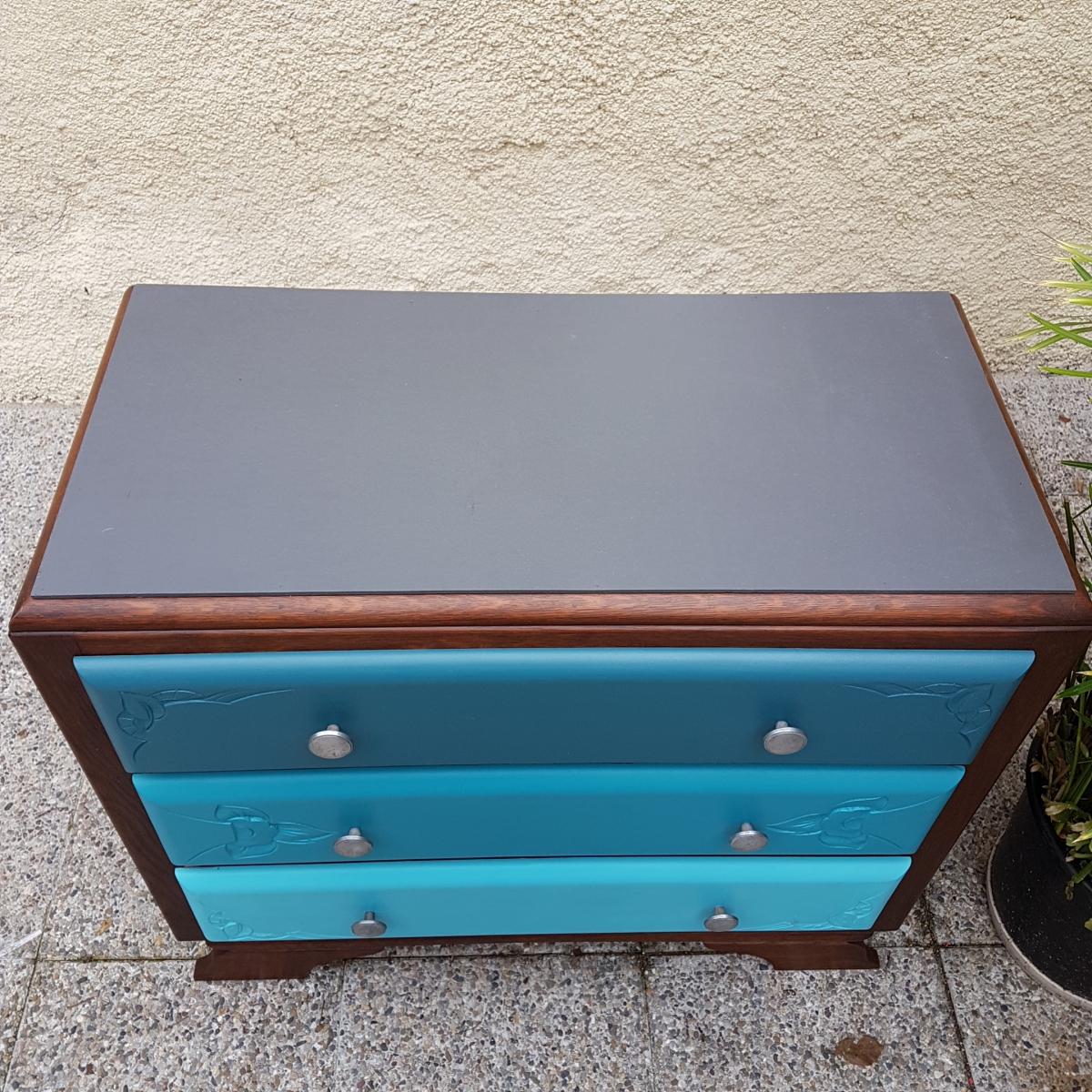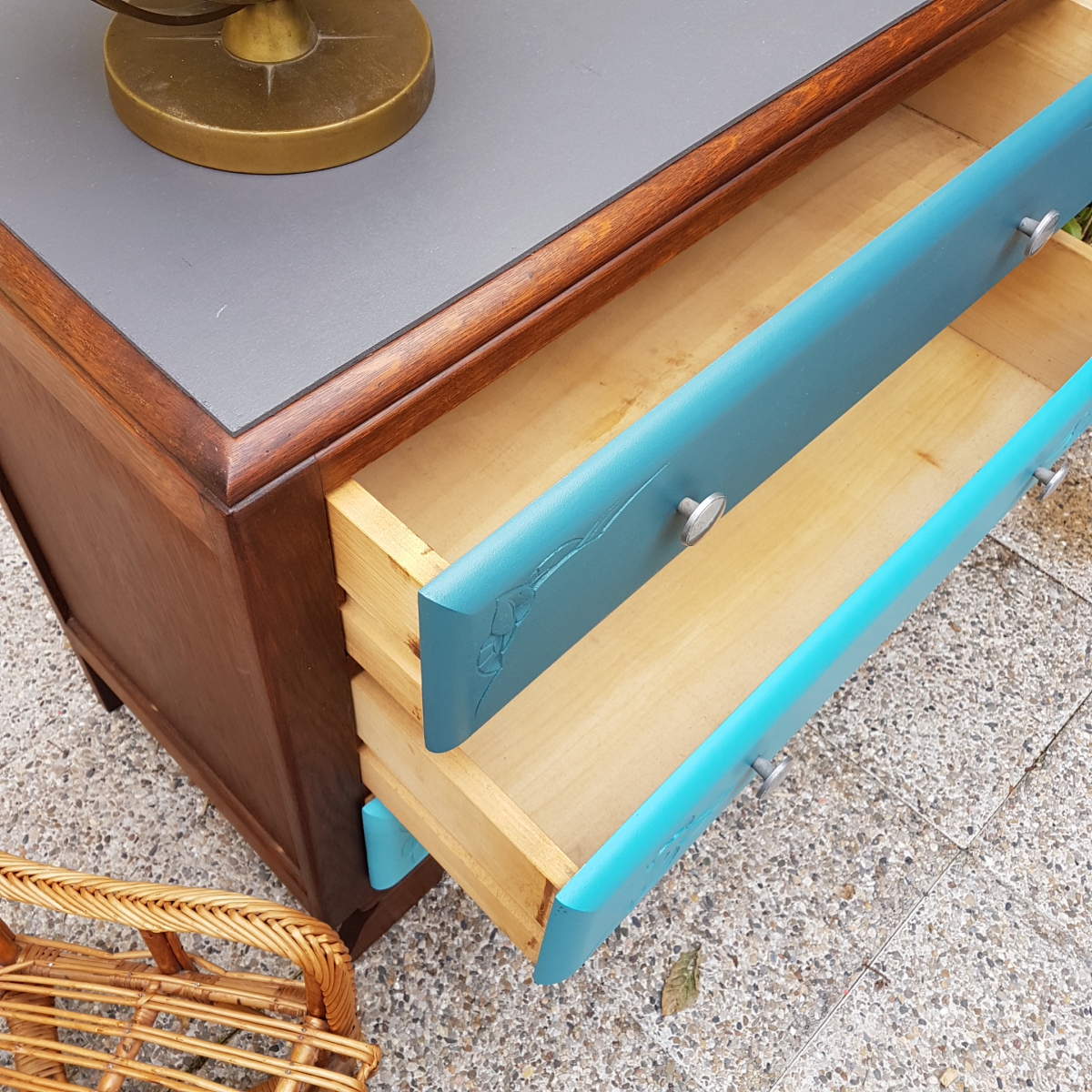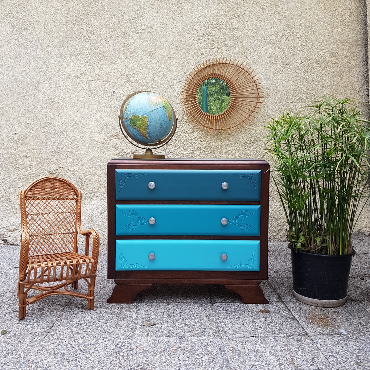 Petite commode style art déco en bois foncé et tiroirs en dégradé de bleu