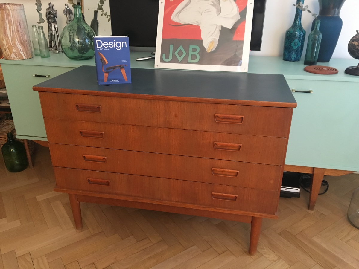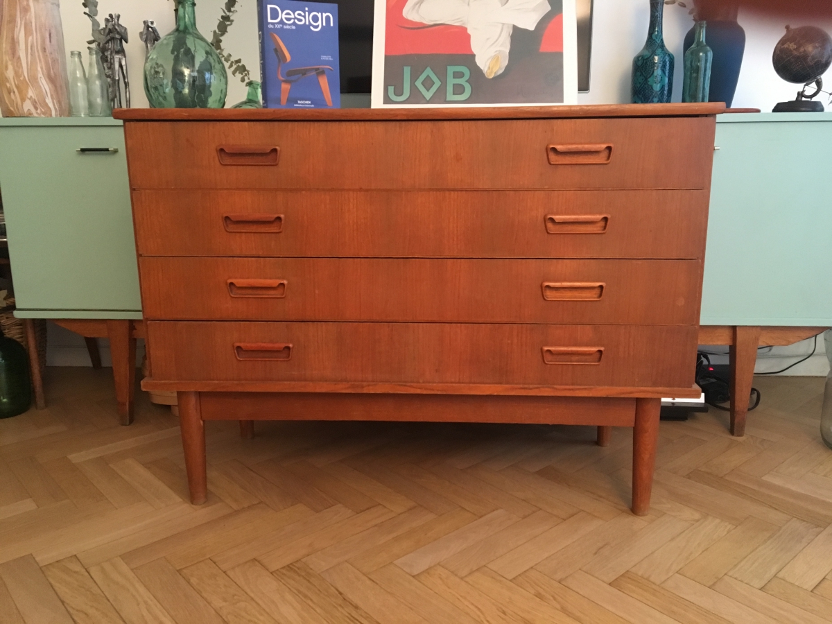 Commode vintage pieds compas 70's qui pourrait devenir un meuble sous vasque sans problème.