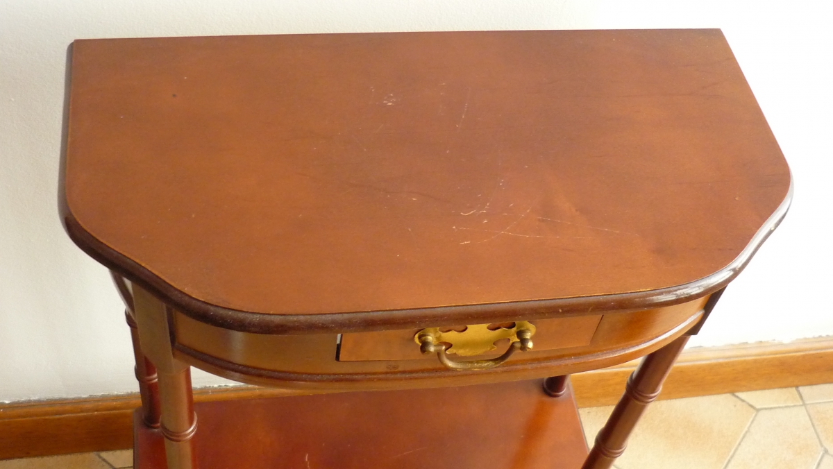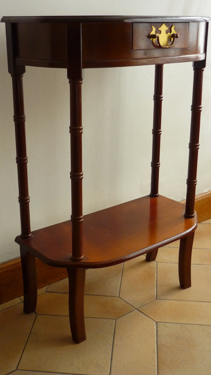 Jolie petite sellette en plaqué merisier. Elle trouvera facilement sa place dans une entrée. Pour les plus courageux, elle peut être poncée et repeinte à son goût;) pur trouver sa place dans une salle de bain ou autre... Dimensions: P.24 x L.48 x H.72. Livraison à domicile chez le vendeur.