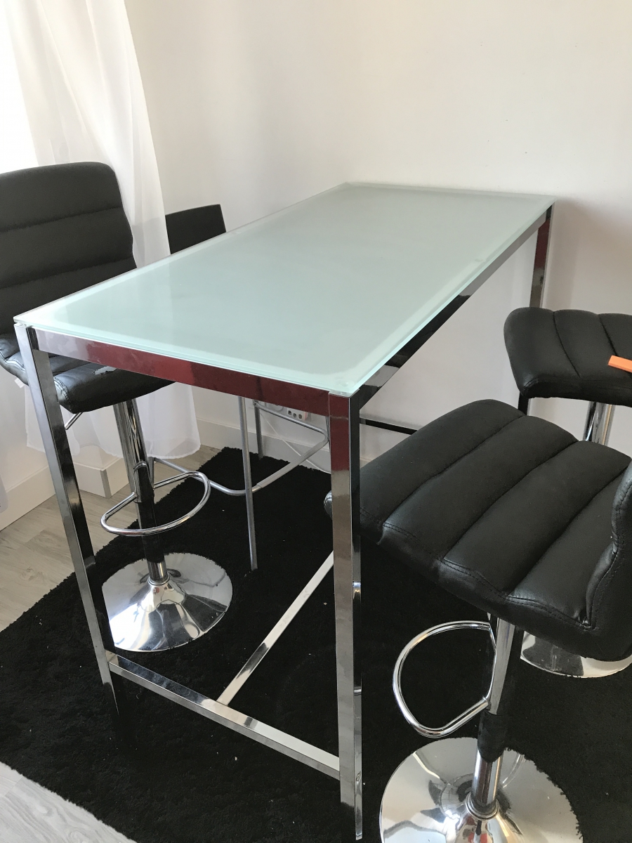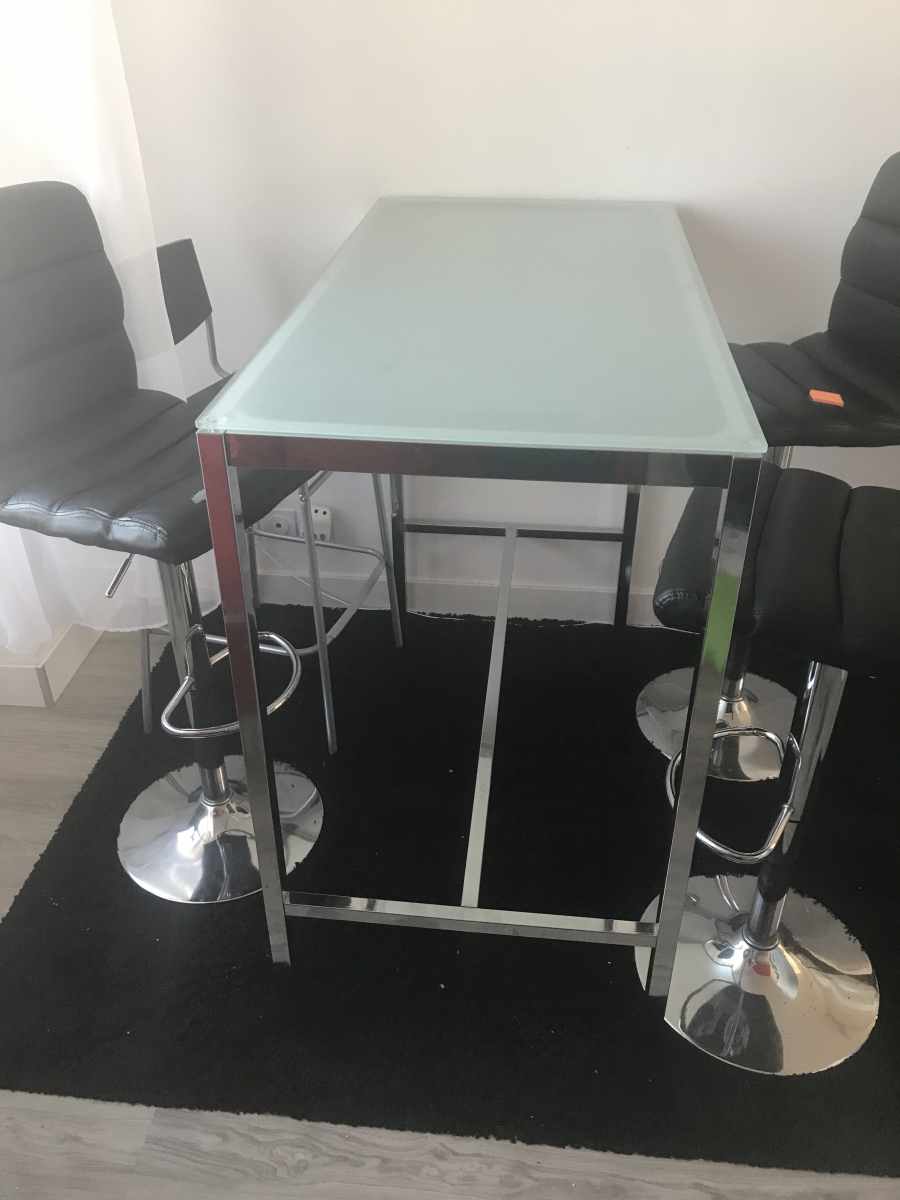 Je vends une table haute de séjour, comme neuve. La monture de la table est en inox mais le dessus est en verre.