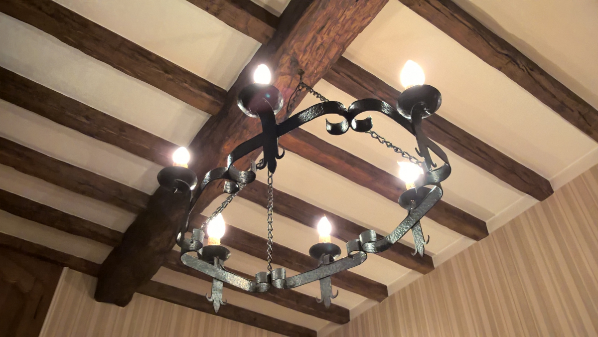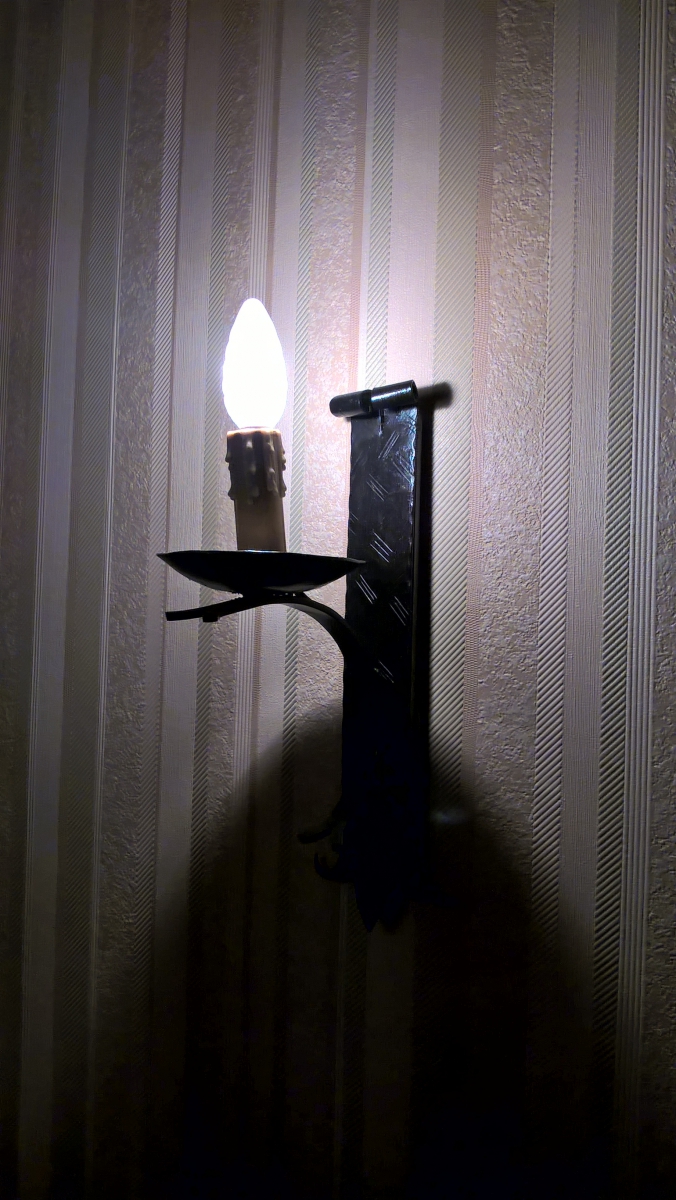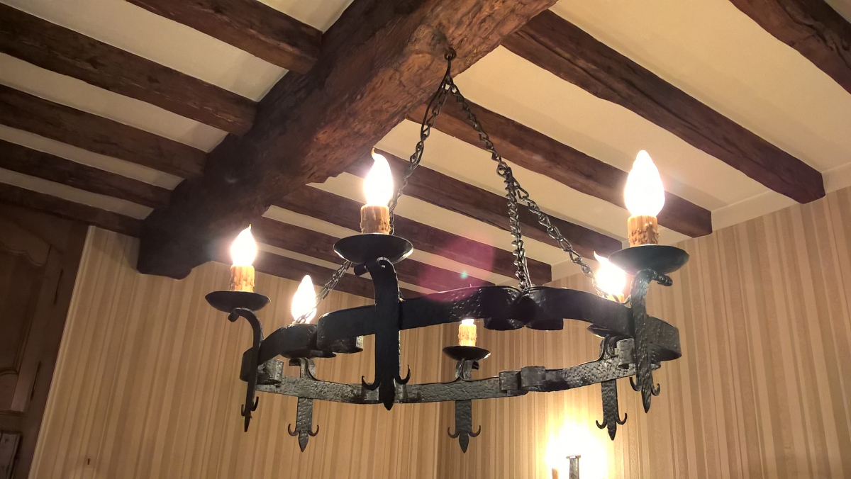 Grand lustre ferronné avec ses quatre appliques, type gothique, daté des années 1950.
