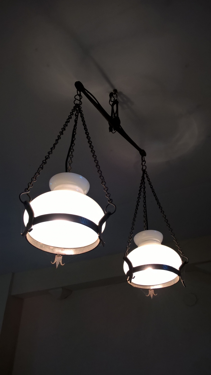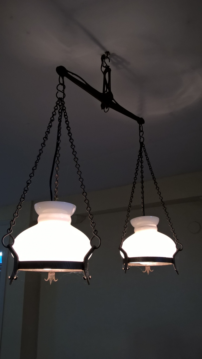 Suspension acier et opaline, balance de minotier