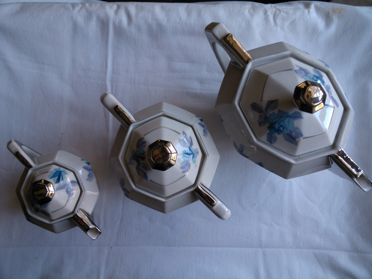 Excellent état général. Ce service est composé de six tasses et six sous-tasses. Ainsi que d'un pot à café, un pot à sucre et un pot à lait. Aucune brèche à déplorer. Les couleurs des motifs et liserets sont toujours aussi vives.