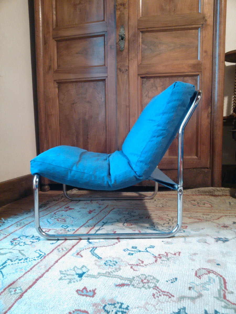 Ensemble de 5 fauteuils en tissus bleu et armature acier, type Herlag