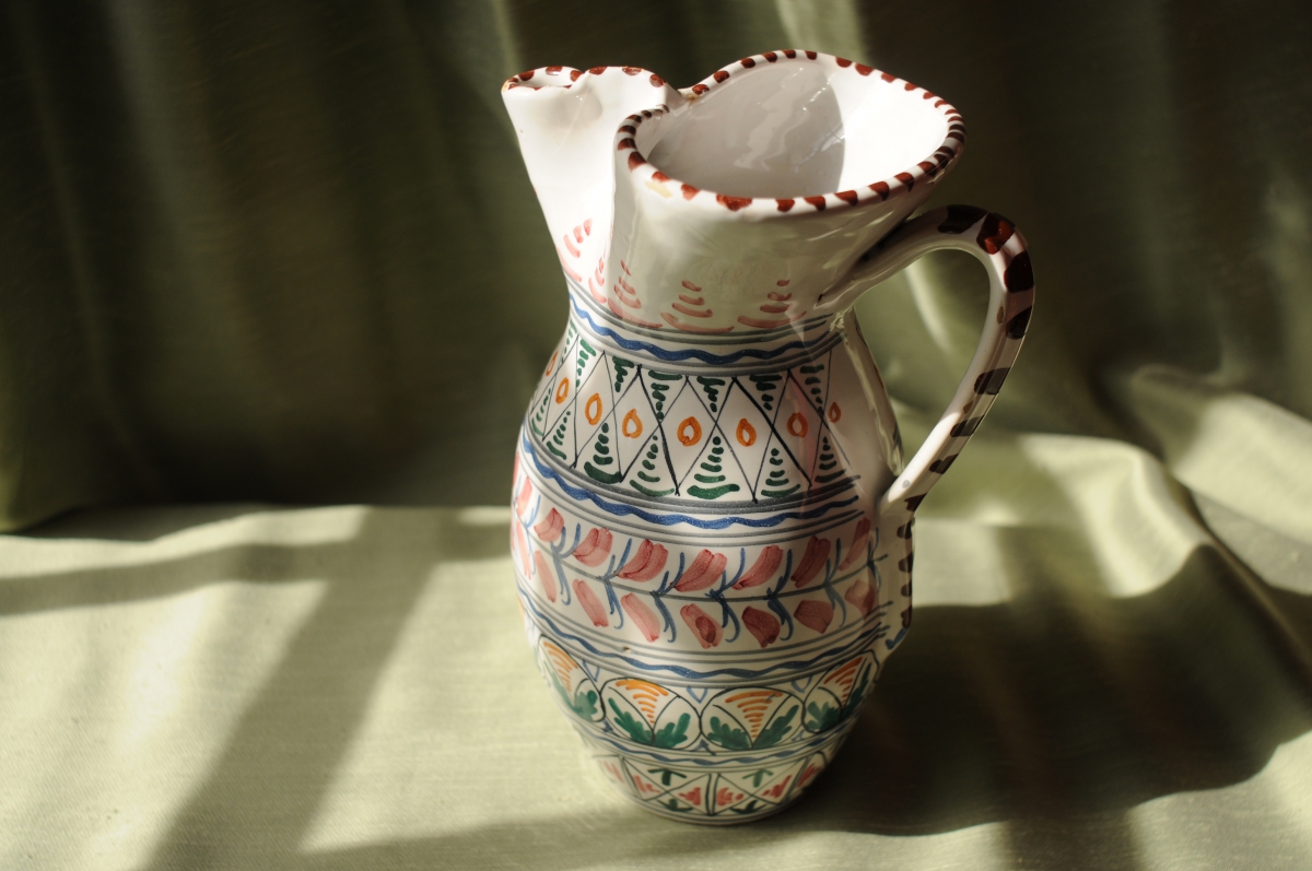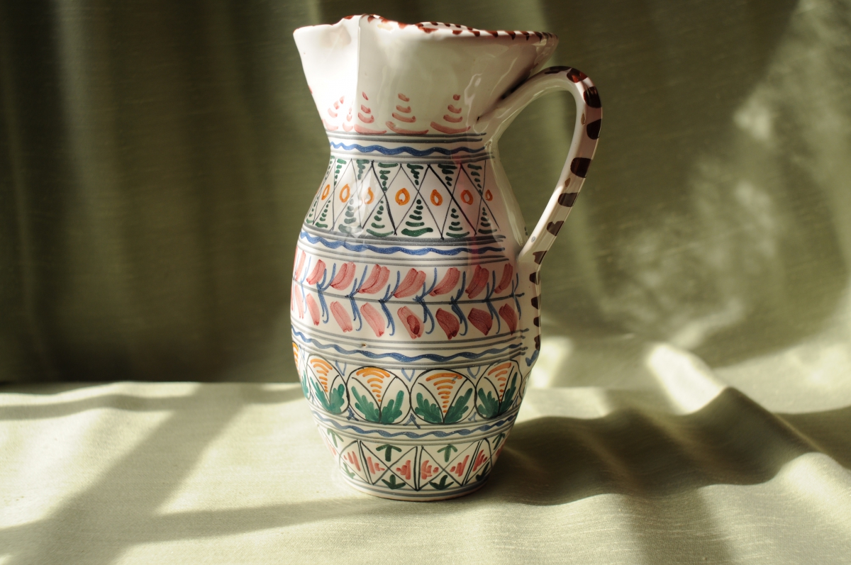 Petit coup de cœur pour cette jolie cruche aux formes évasées et aux motifs délicieusement colorés. Il semblerait bien que cette cruche soit issu de l'artisanat local de Tolède.