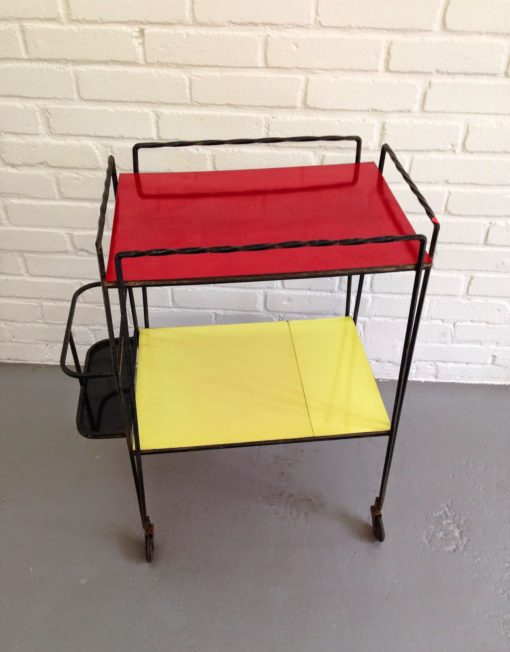 Une desserte roulante en fer forgé torsadé sur le haut, deux plateaux en formica jaune et rouge.