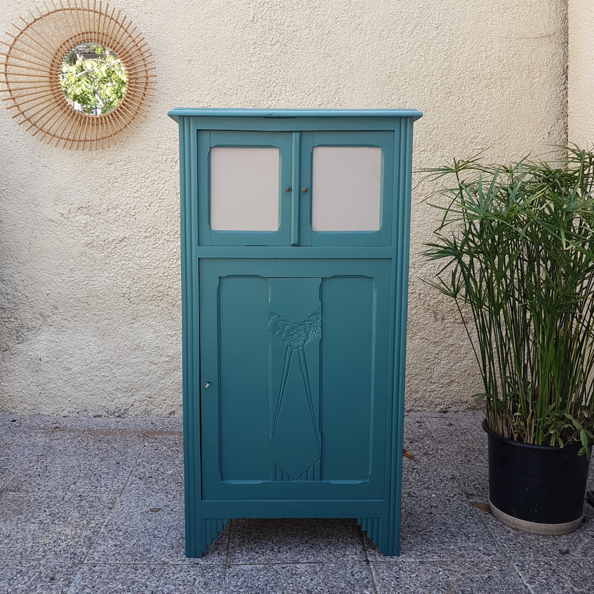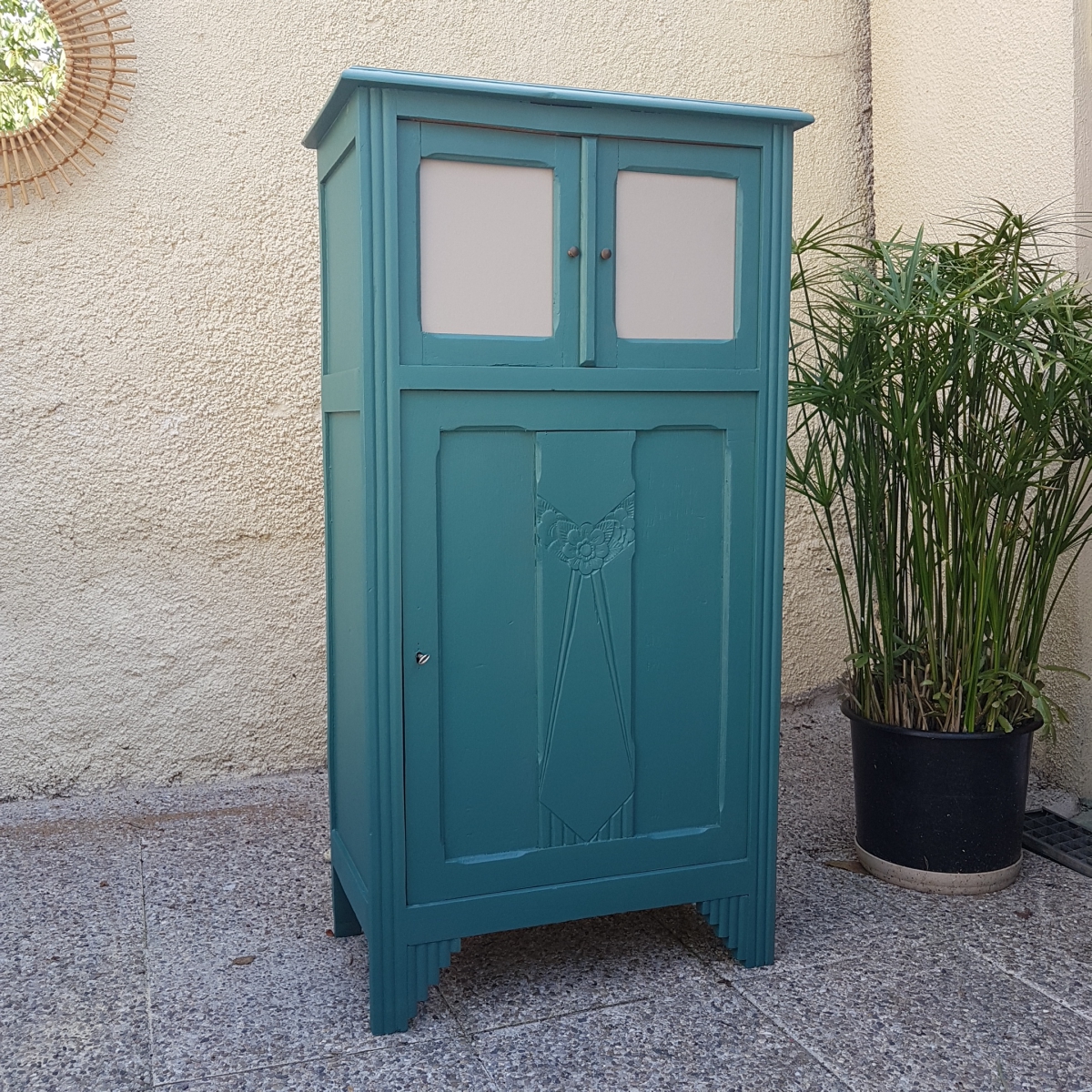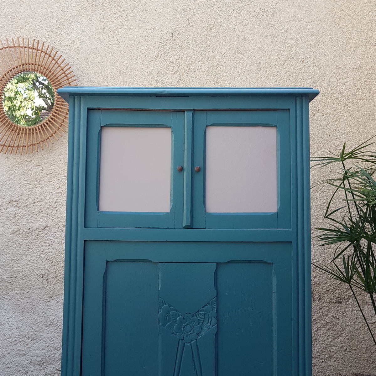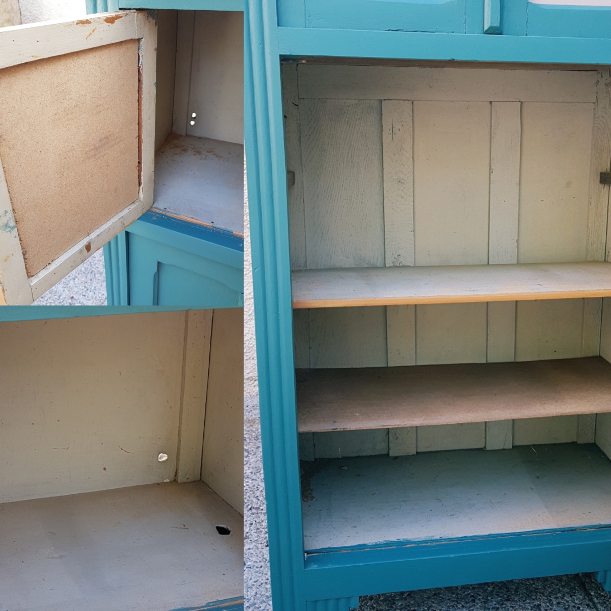 A noter que l'intérieur est resté dans son jus. nous avons les vitres des deux petites portes du haut. elles ont été remplacées par deux plaques de médium qui peuvent être recouvertes de tissu ou peintes dans une autre couleur.