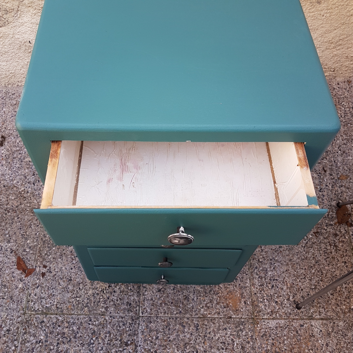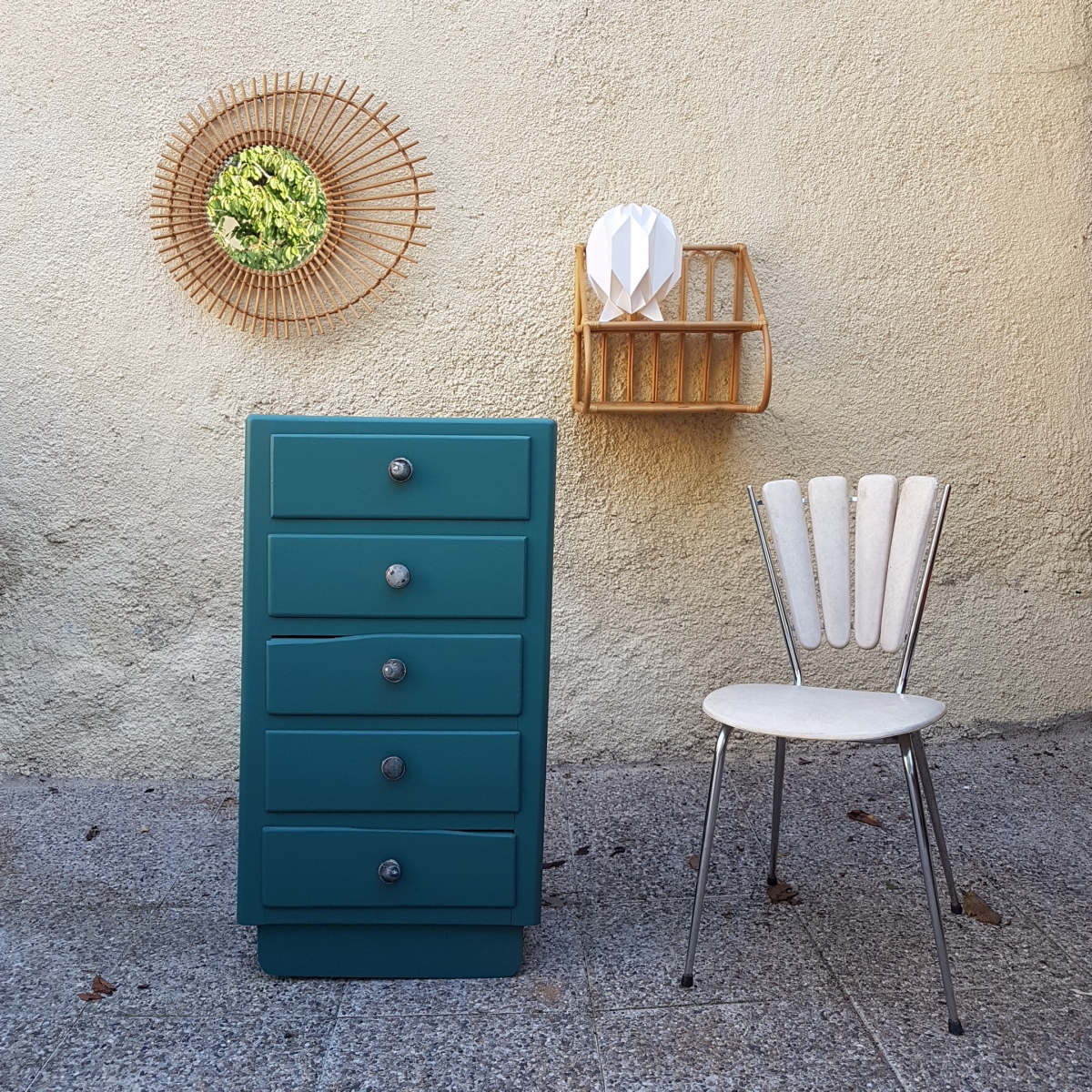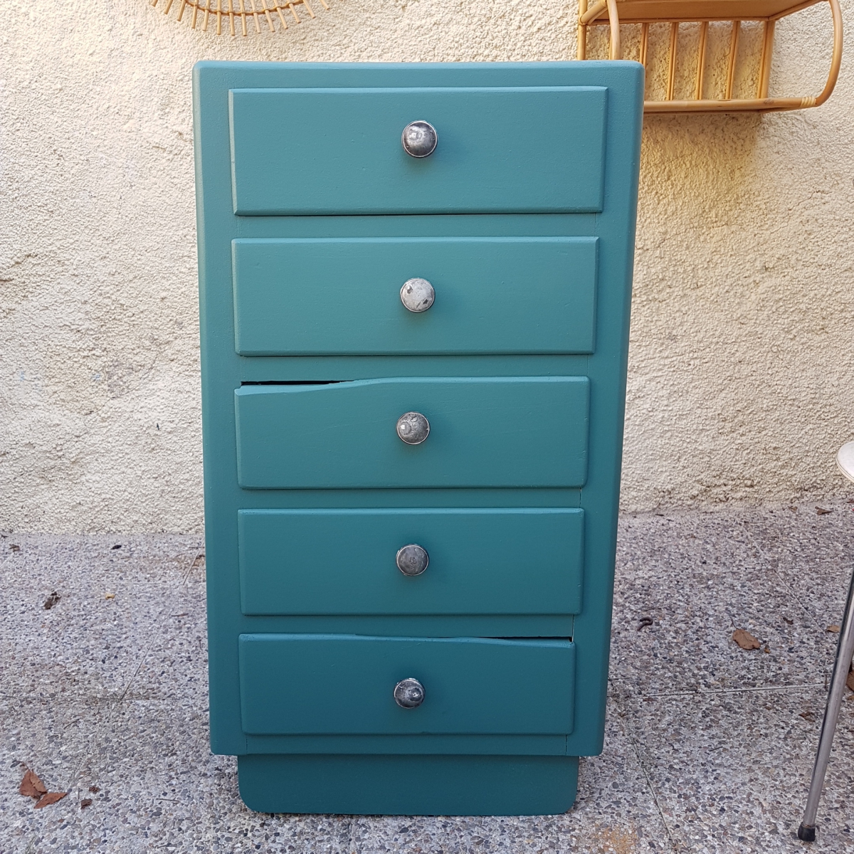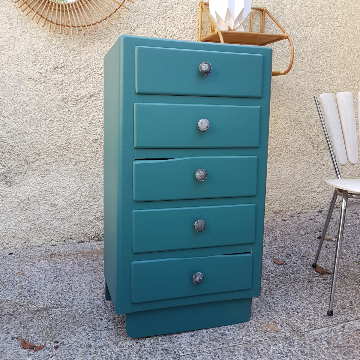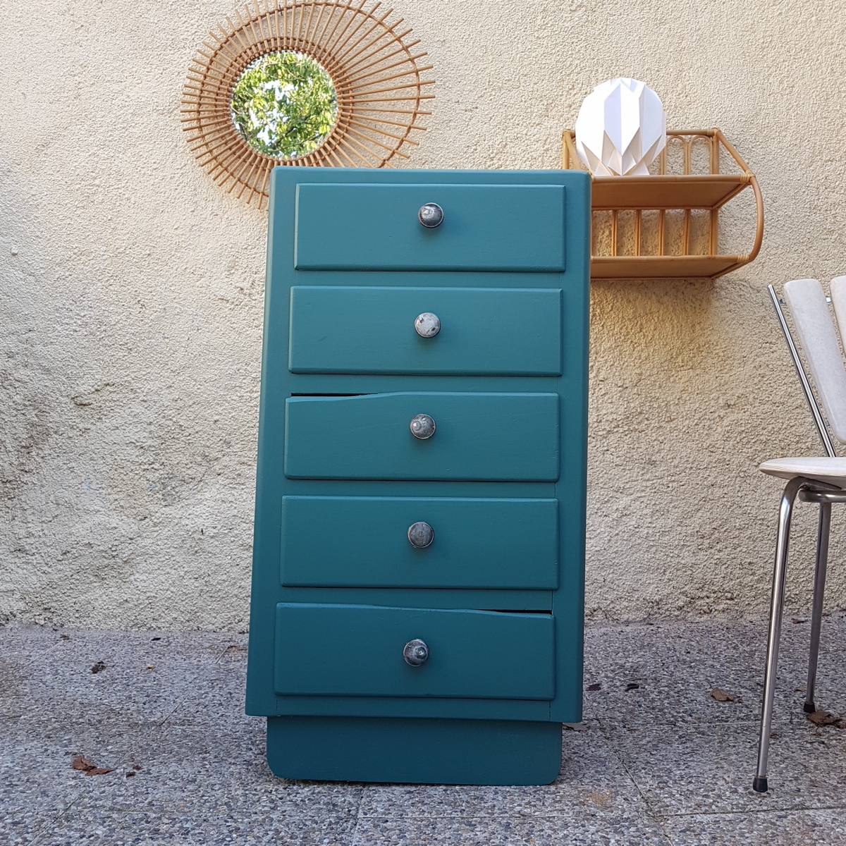 chiffonnier au look décalé! très belle patine des poignees et son pietement arrondi est une alternative originale aux classiques pieds compas.