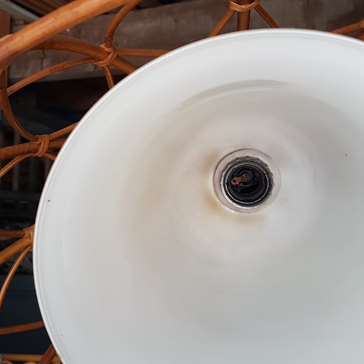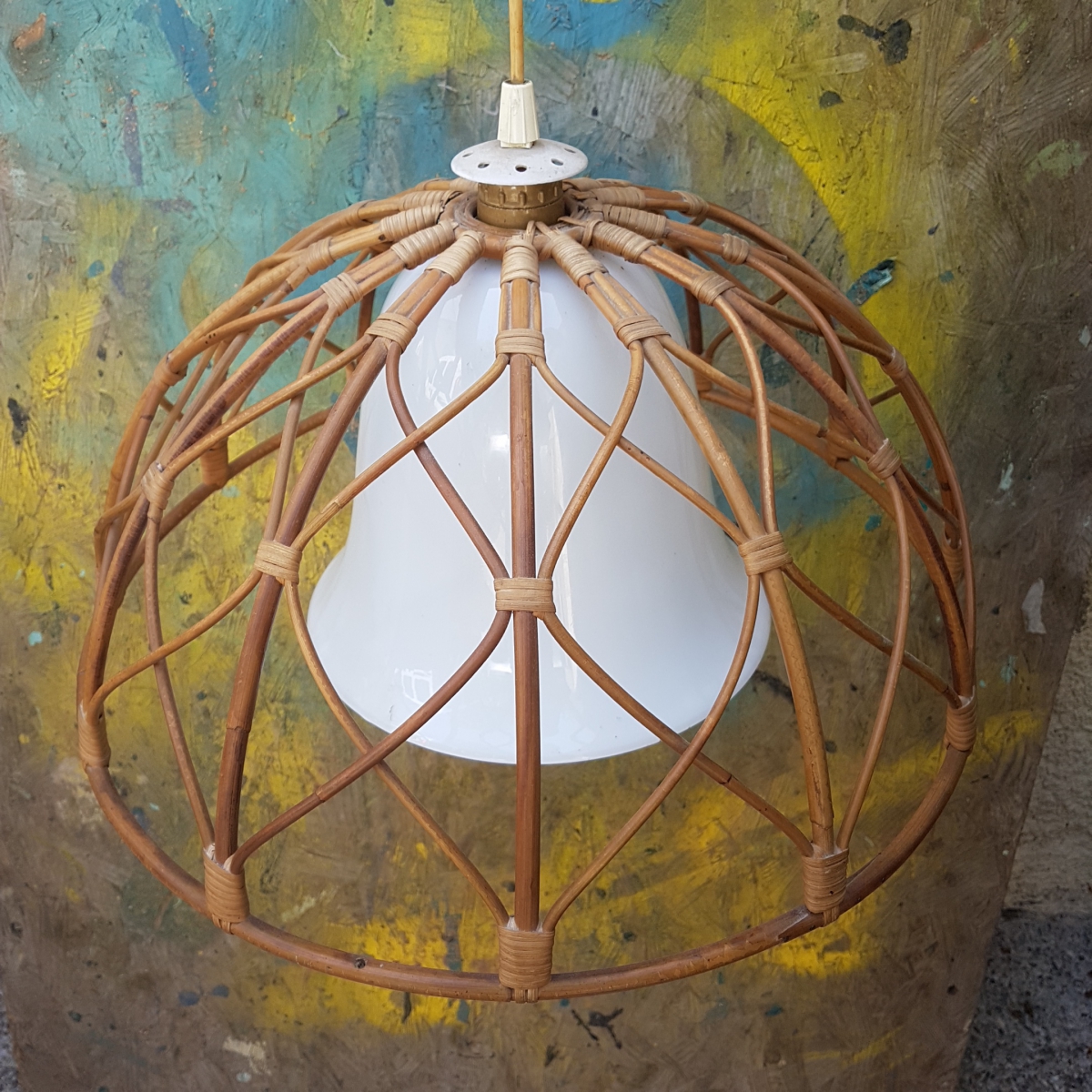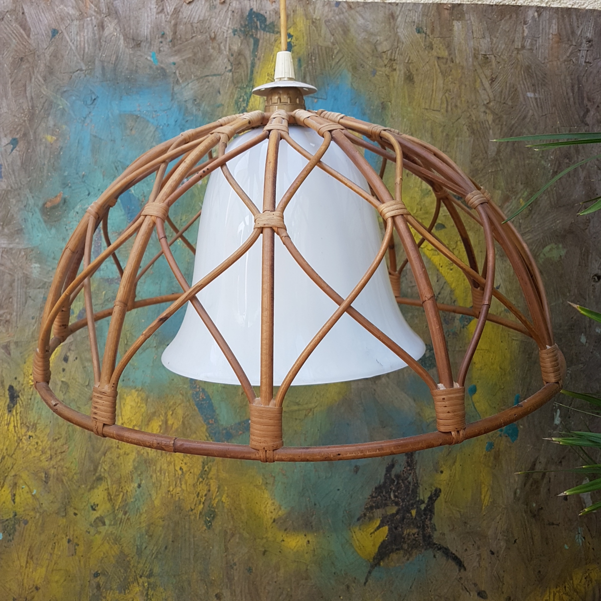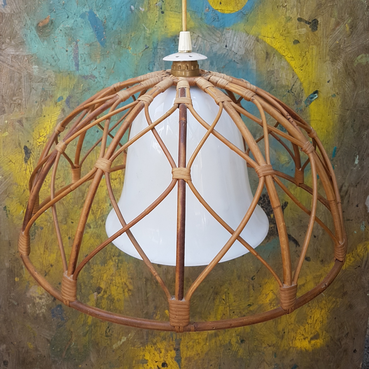 Suspension atypique avec sa cloche en opaline Blanche avec une coupe en rotin.