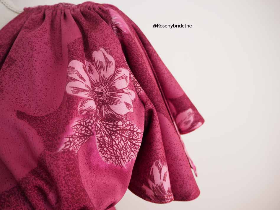 Aucune étiquette à signaler. La robe est cousue main dans un tissu synthétique, fluide et légèrement élastique.