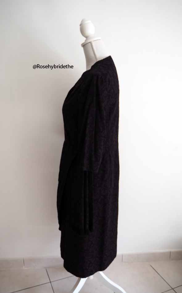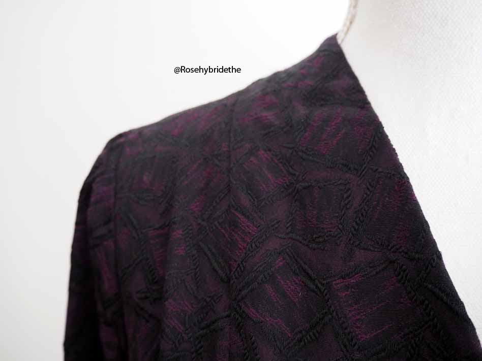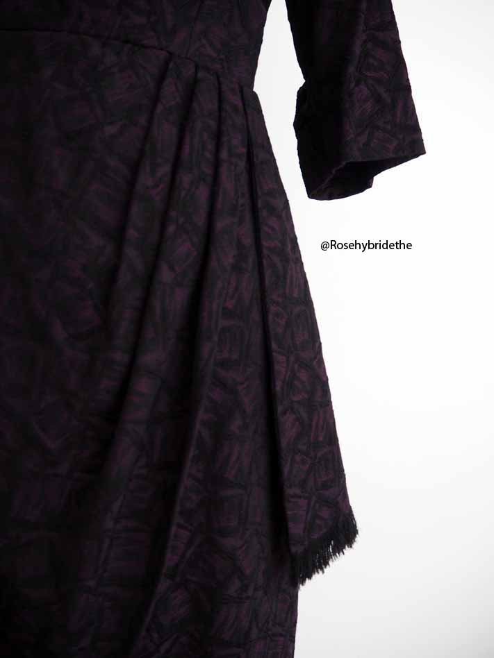 Tissu épais en relief noir et violine façon brocart. Aucune idée sur la composition de la robe (aucune étiquette, la robe est cousue main).