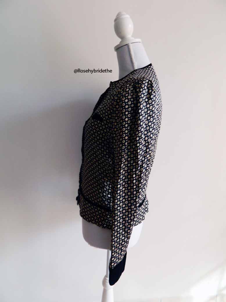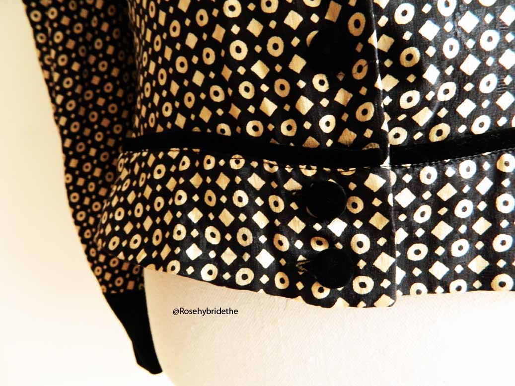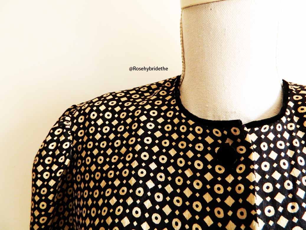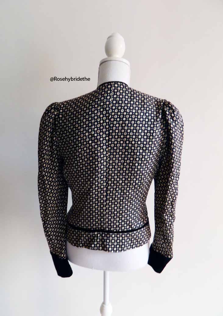 Très belles finitions ! Galons en velours noirs au cou et en bas du chemisier. Poignets en velours noirs, fermés par un bouton.