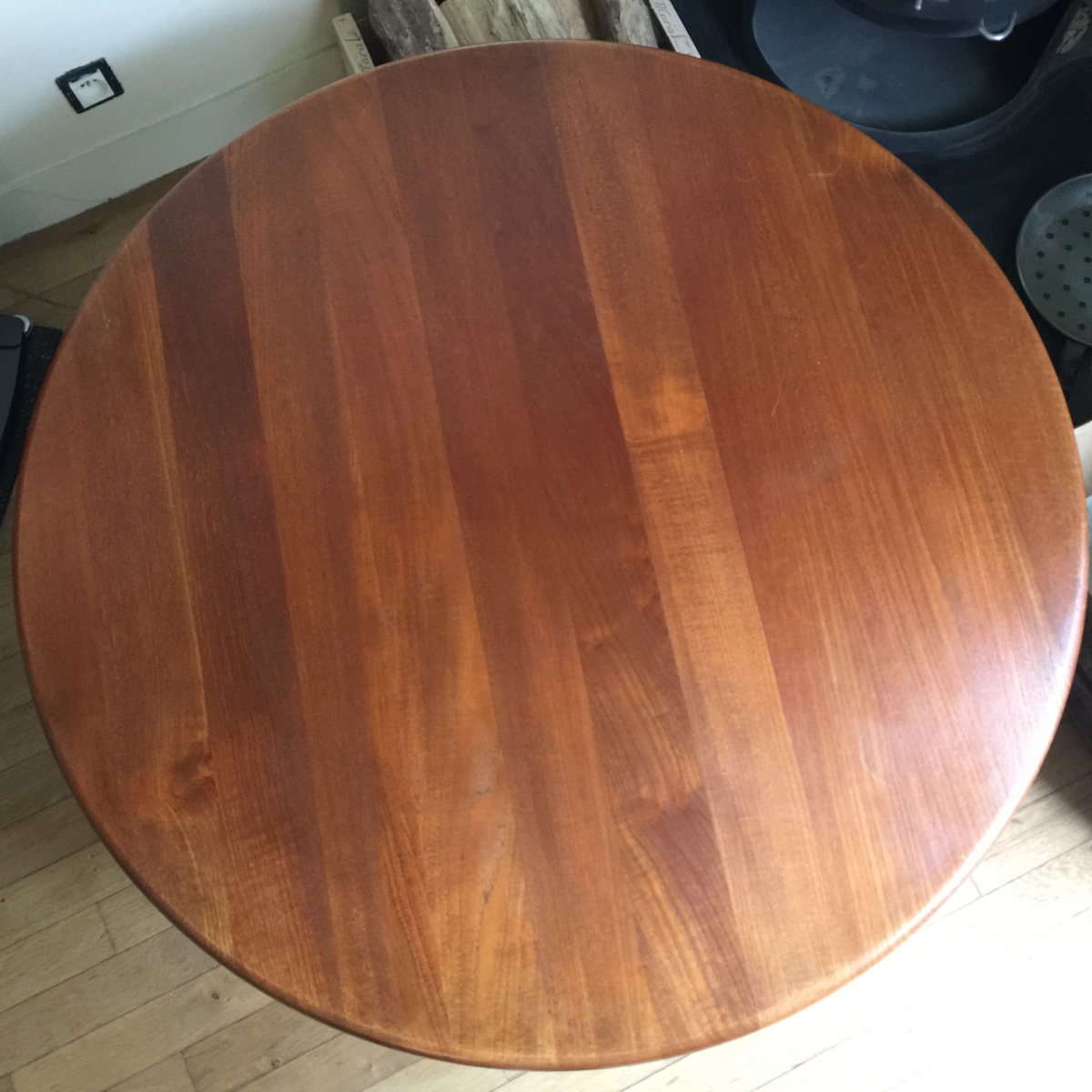 Table basse ronde datée 60, en parfait état, pièce unique scandinave en bois de teck massif.
