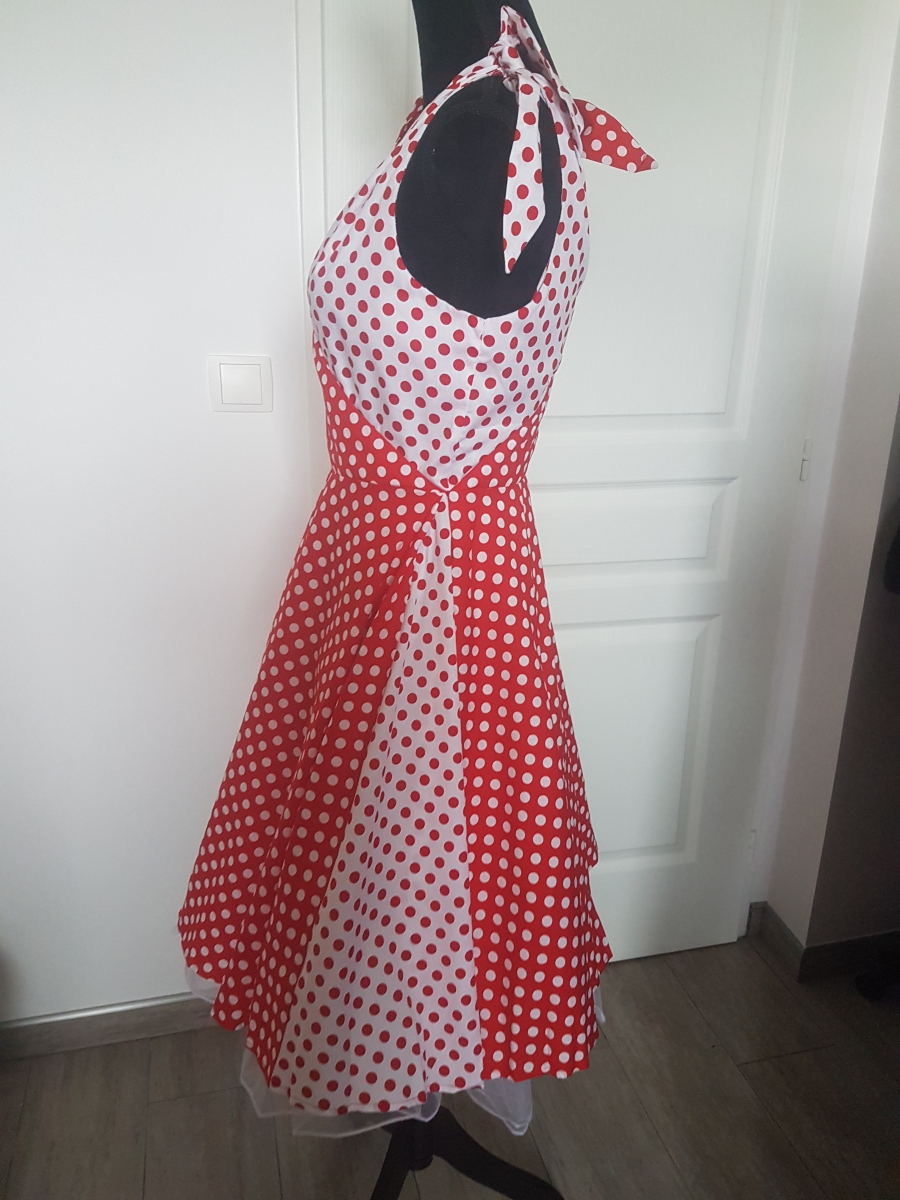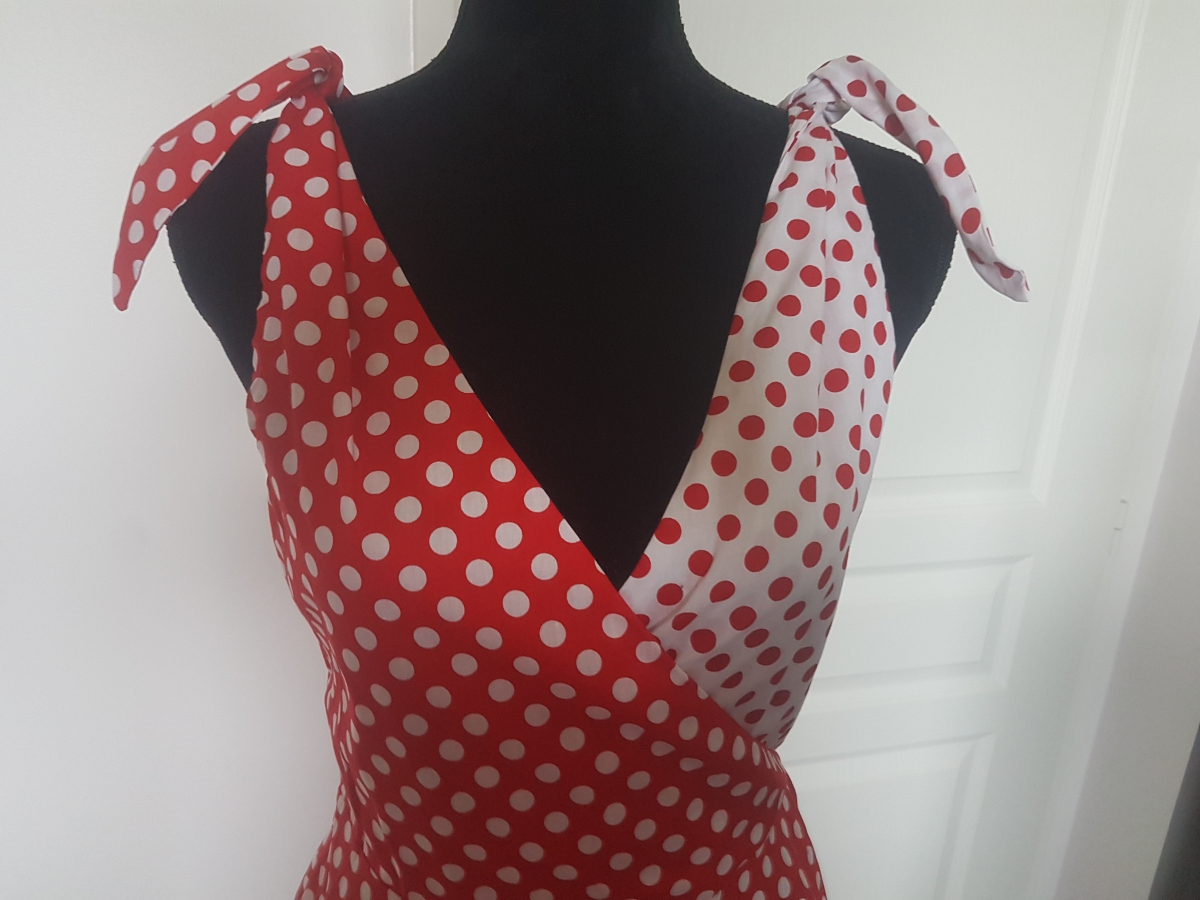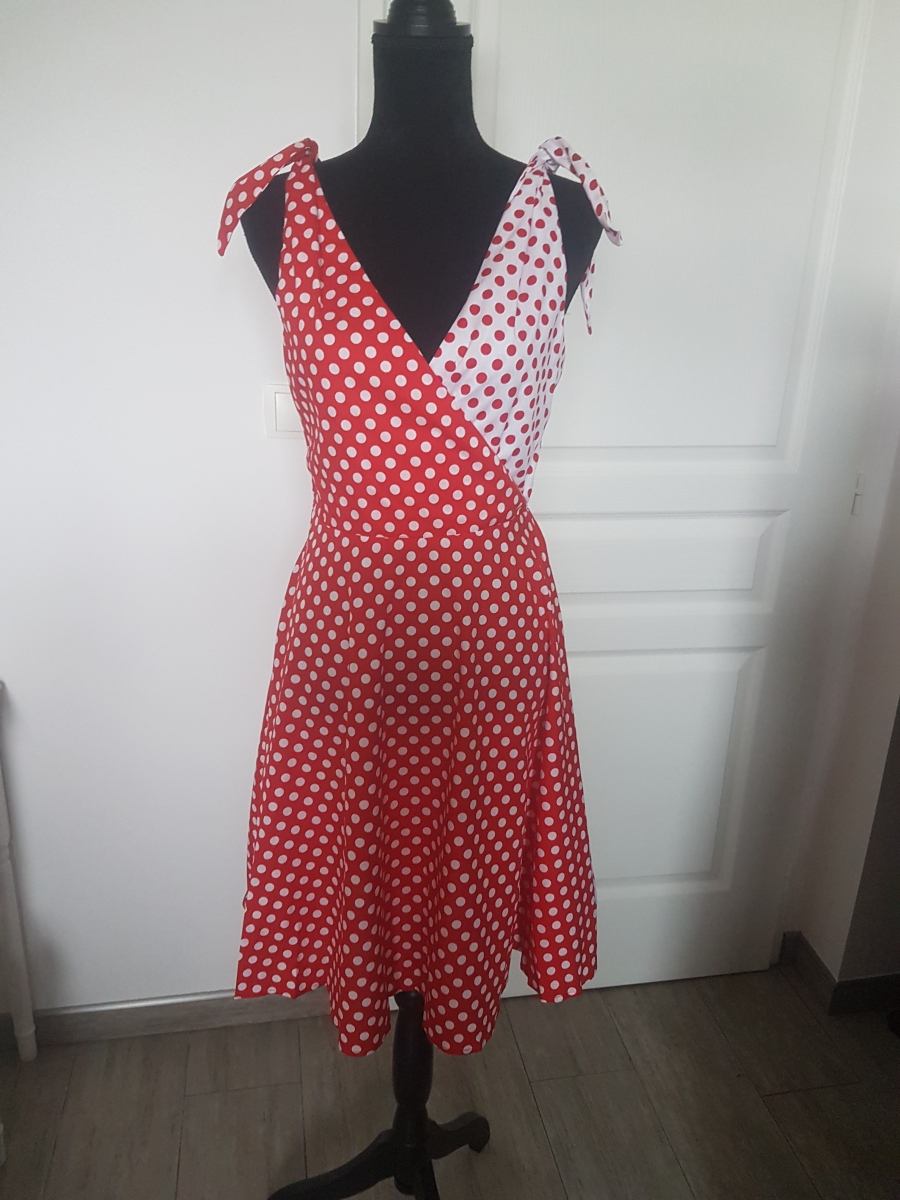 Jolie robe à pois. Elle se noue aux bretelles et a une fermeture éclair sur le côté.