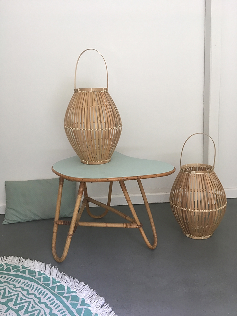 Table basse en rotin vintage années 50/60, forme haricot, dessus repeint en vert d'eau, puis vernie avec un vernis mat, très bon état.
