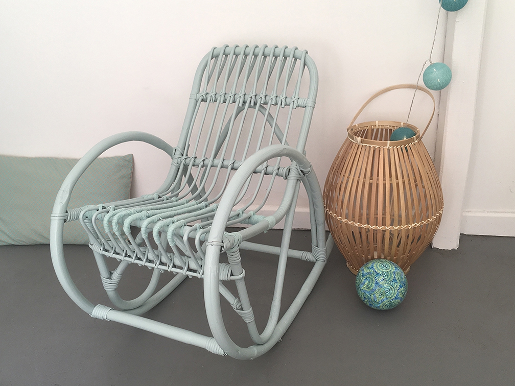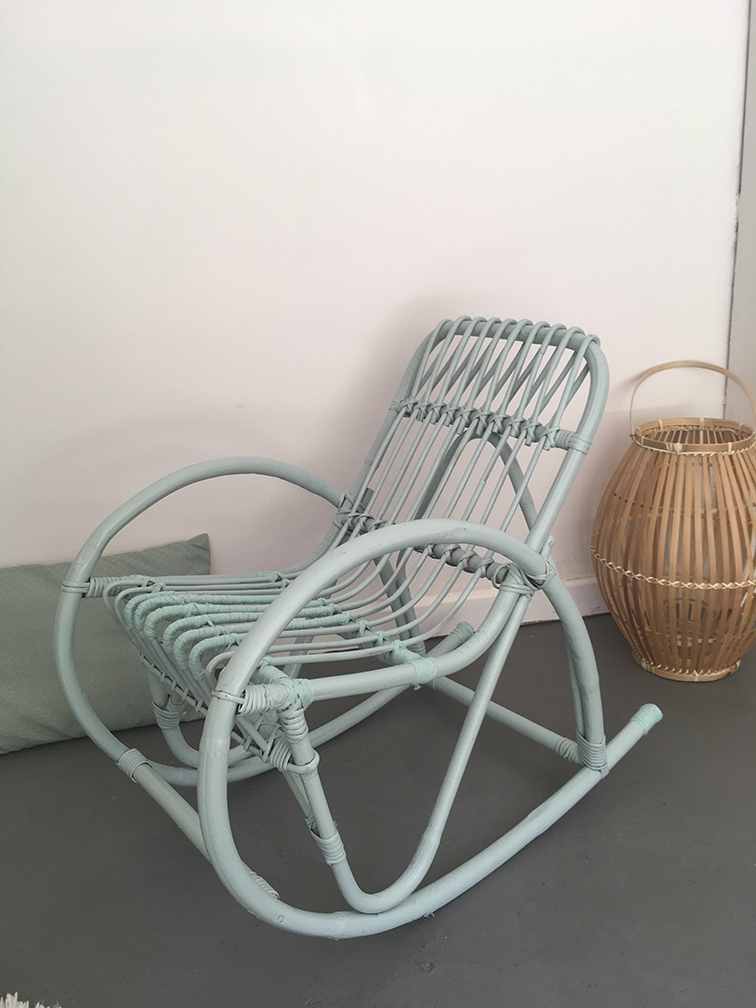 Rocking-chair vintage en rotin repeint en vert d'eau. Il manquait des brins d'osier, qui ont été remplacés par des "pansements" ton sur ton en ruban de coton vert d'eau. Il a quelques défauts mais il est plein de charme et tout à fait fonctionnel.