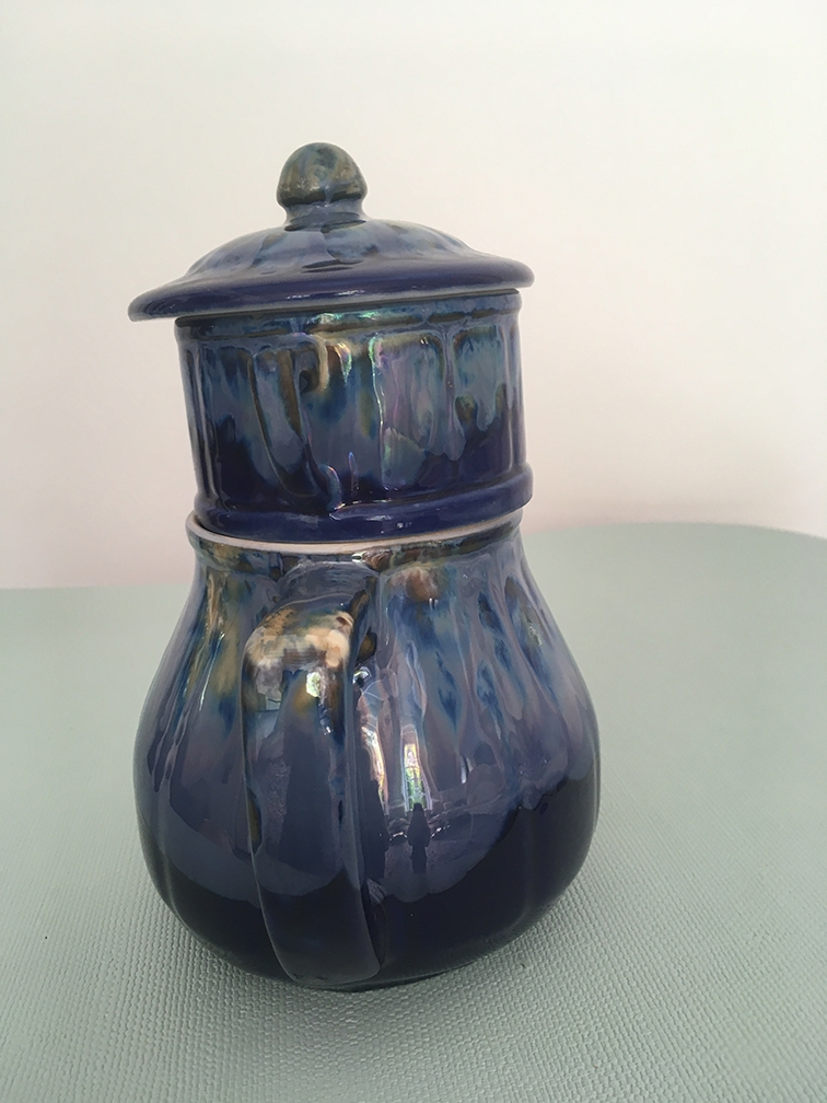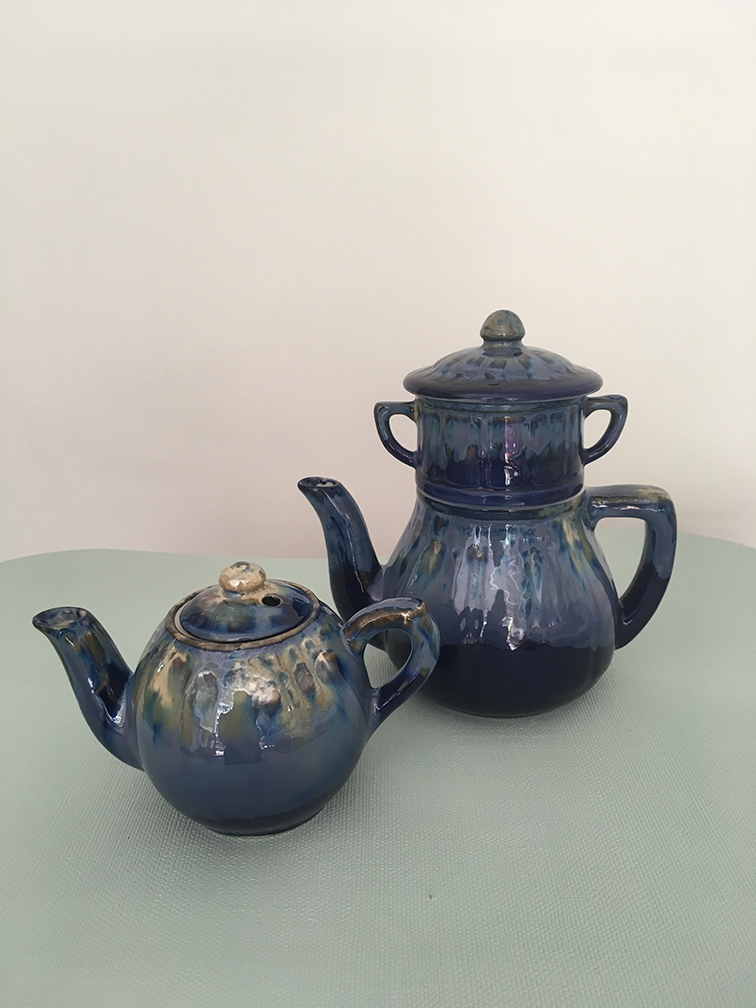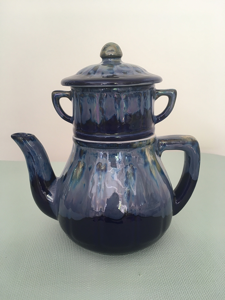 Théière vintage trois pièces en céramique, peut aussi être utilisée comme une théière normale (le compartiment entre le couvercle et le pot sert à mettre le thé).