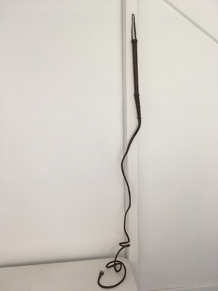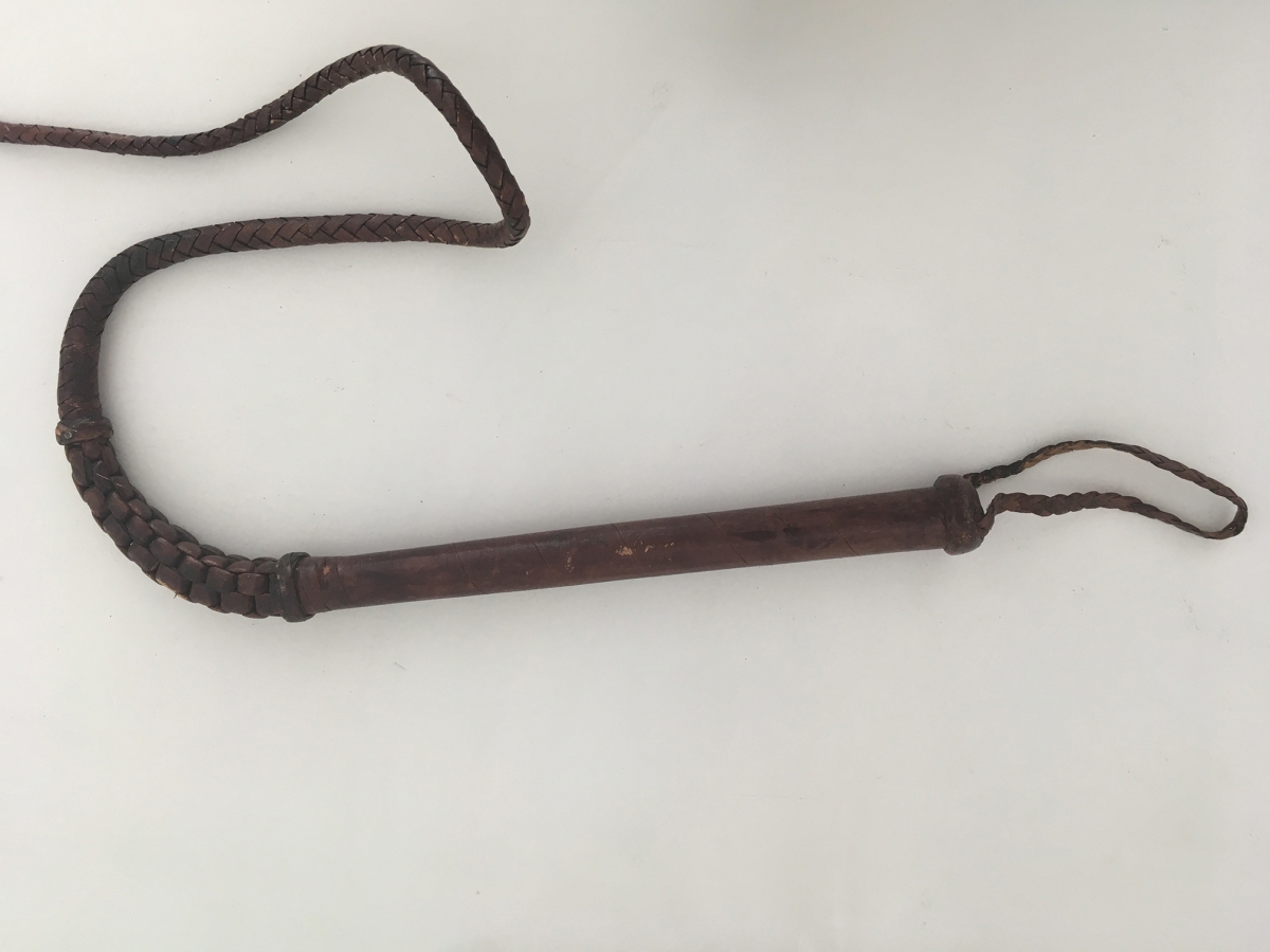 Fouet en cuir marron , lanière tressée, quelques éraflures sont présentes sur le manche.