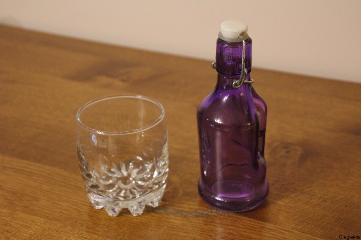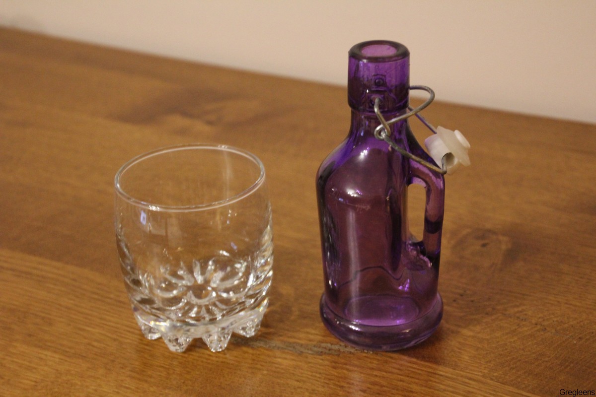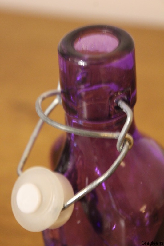 Jolie petite bouteille en verre de couleur violette. Originale avec anse sur le côté et fermeture à capsule type bouteille de limonade en résine.