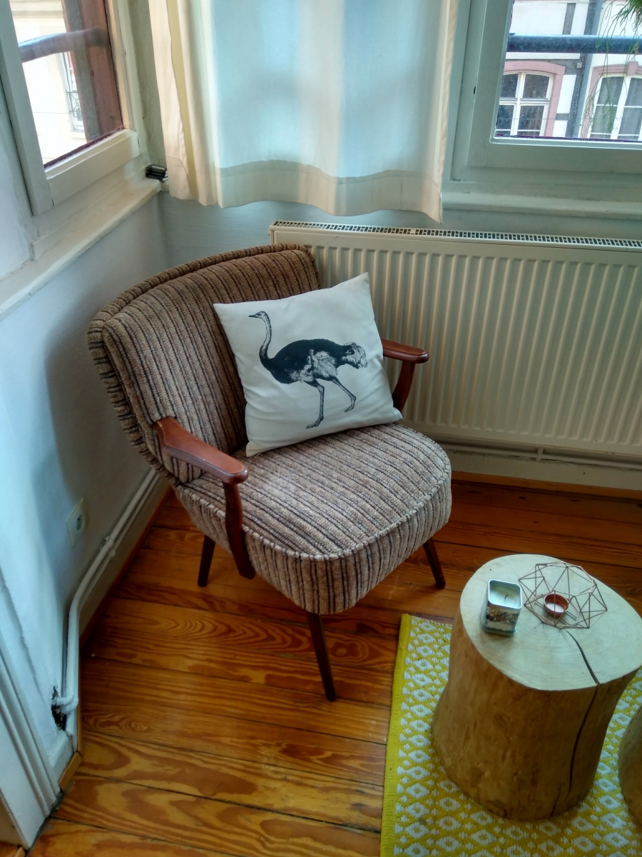Fauteuil avec accoudoirs et pieds compas, en parfait état.