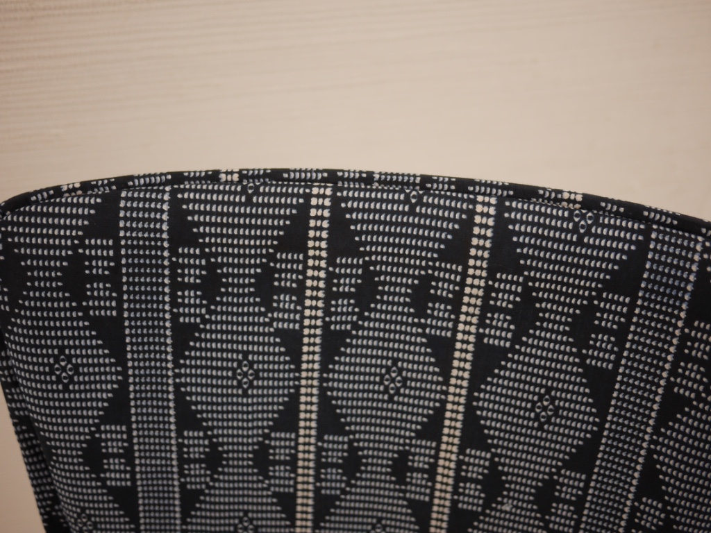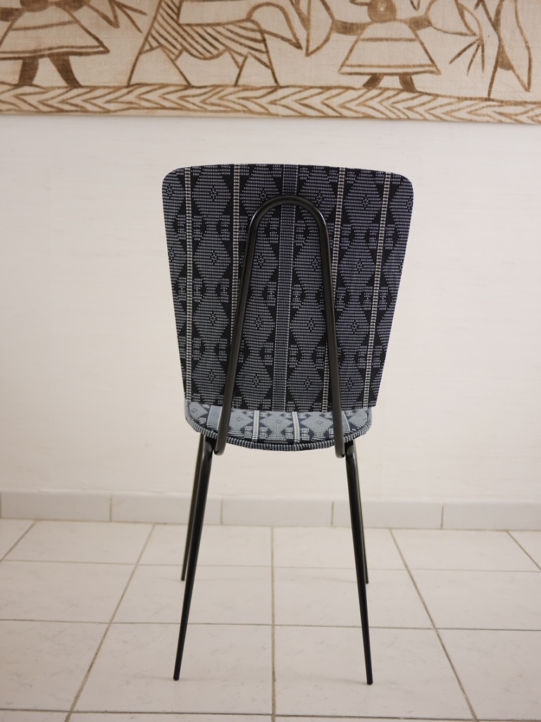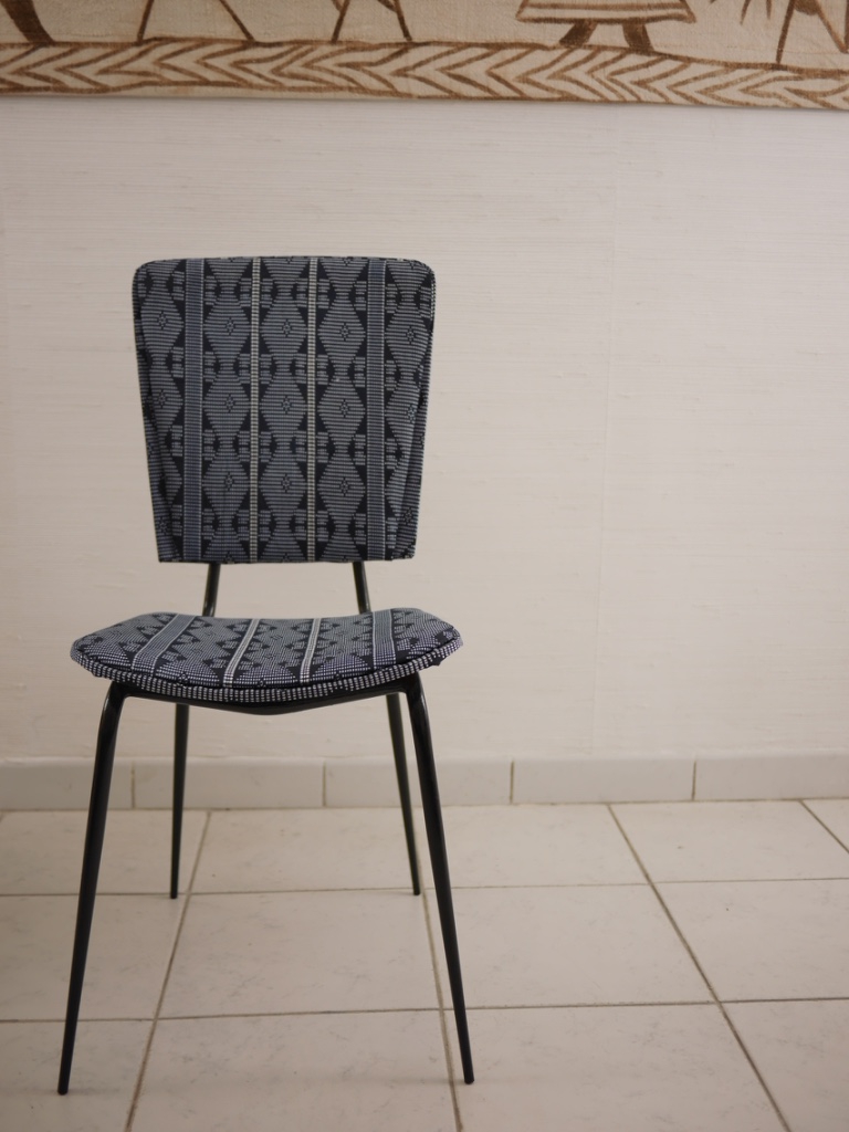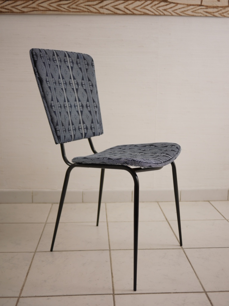 Ancienne jolie chaise en acier tubulaire et bois, rénovée et recouverte avec du tissu wax, pour un mélange des styles vintage, bohème et ethnique détonnant !
