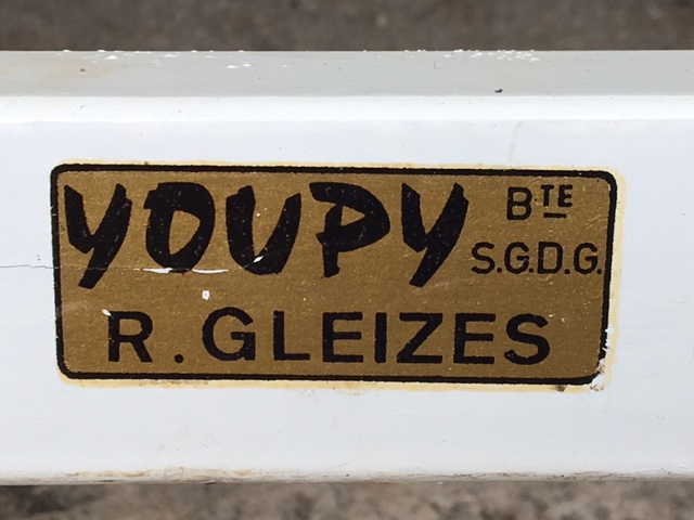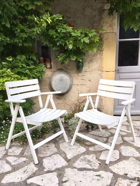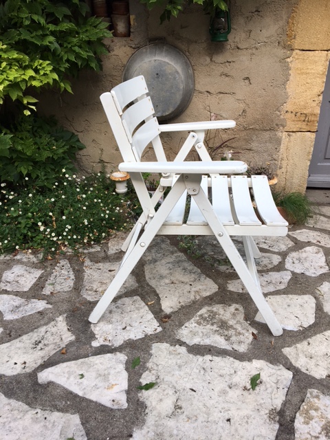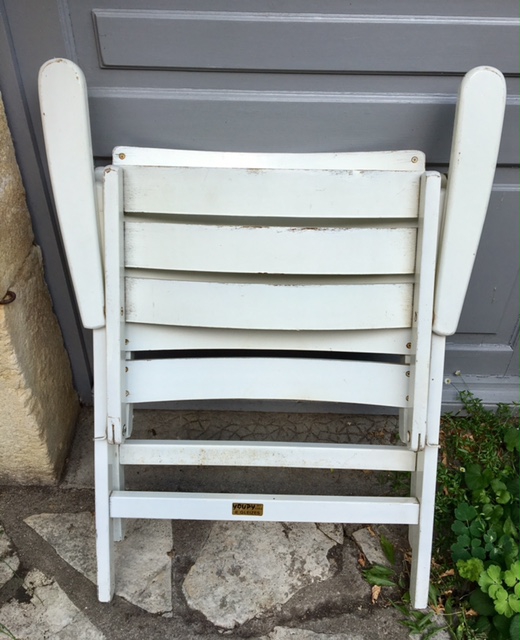 Paire de fauteuils de jardin pliants en bois peint en blanc.