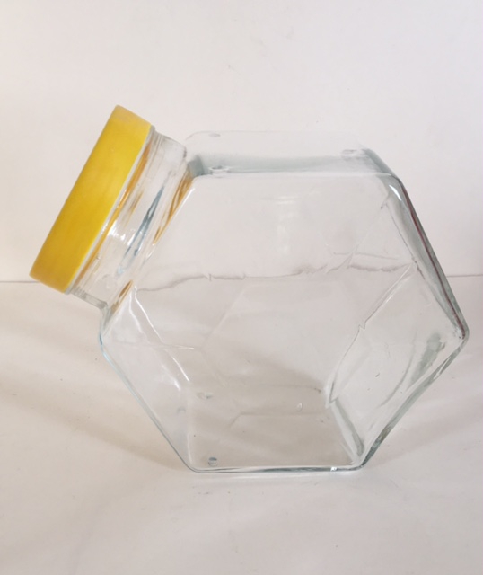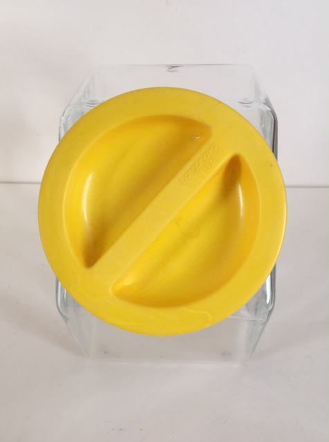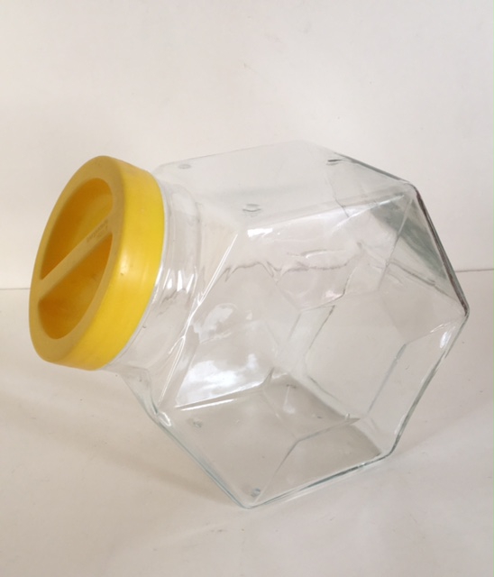 Bocal à bonbons en verre et couvercle en plastique jaune.