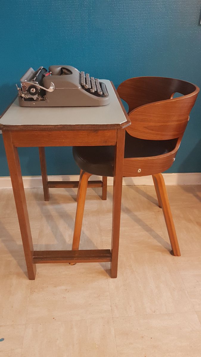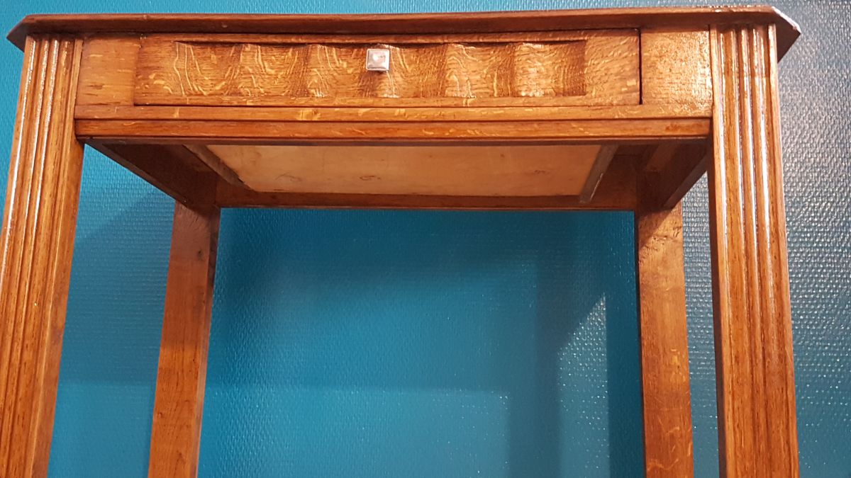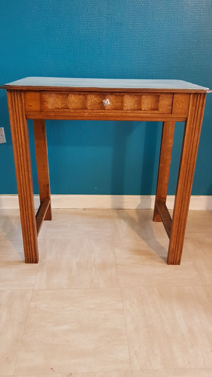 Table à écrire avec tiroir. Le bois est travaillé sur les pieds et les bords du plateau et le tiroir. Une résine verte bleue a été posé sur le plateau pour lui apporter un brin de modernisme et une grande resistance. L ensemble est en bois massif ciré avec des produits naturels.
