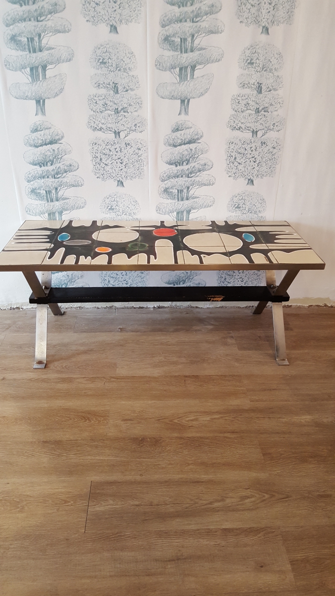 Voici une solide table basse vintage. Epoque seventies. Avec un motif abstrait et de belles couleurs pour mettre une touche de gaité dans le salon.