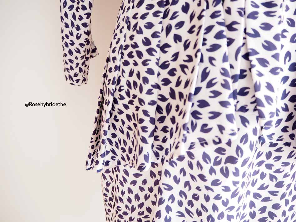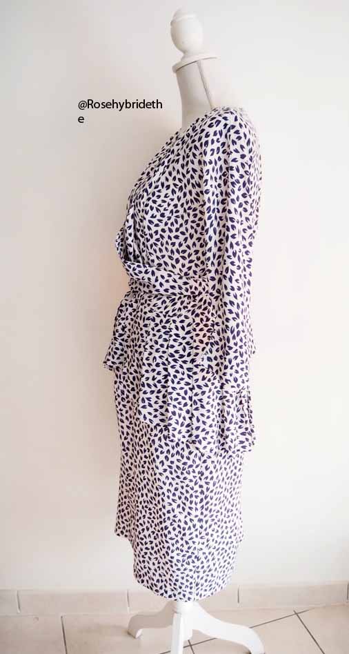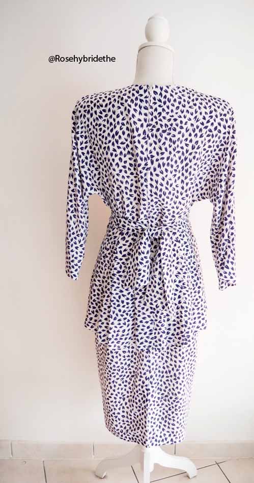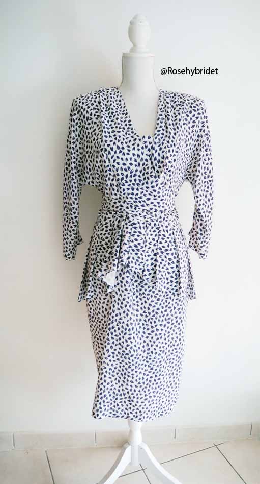 Jolie robe peplum blanche avec des motifs bleus marine de la marque IMPRESSION PARIS, datant des années 1980.